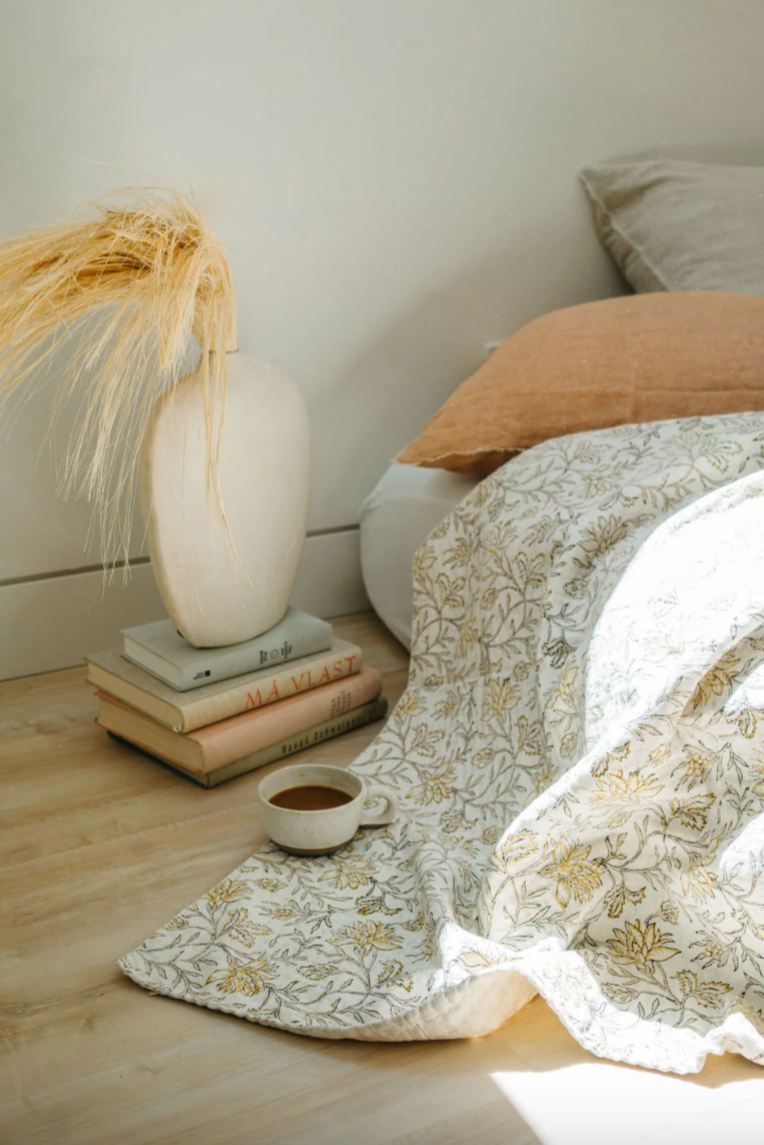 The Carolina Block Print Bed Quilt showcases hand-blocked florals with delicate stripes of traditional kantha stitching. This timeless piece is crafted with care, starting with the intricate process of carving designs into wooden blocks, an art form in itself. The blocks are then dipped in dye and carefully stamped onto fabric to form stunning, repeating patterns. Finally, women in their home villages add the finishing touch with hand kantha stitching, giving the quilt its signature textured feel. Radiating brightness and a summery vibe, this quilt brings warmth and optimism to any space. Dry clean only.