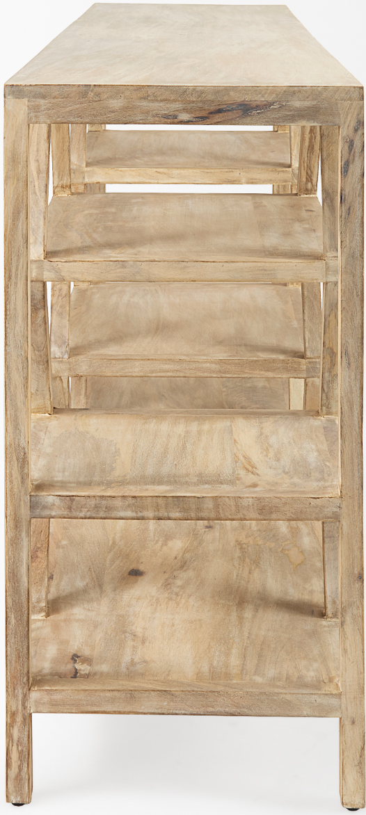 Artistically crafted from durable Indian mango wood, the Dayton is a full-size console table that features a multitude of shelves, so you can display a mix of your favourite décor. The wooden frame on the Dayton is designed such that the shelves are seen on different levels with angular irregularities on the frame. This unique multi-level design is what sets the Dayton apart from the rest and makes it a true head-turner in any living room. At the bottom, it features eight legs that stabilize the table and ensure that you’re able to display a large collection of your most sophisticated items with ease. Finished in a light brown tone that highlights the character and grain of the wood, the Dayton fits best in spaces based on the coastal or farmhouse design styles.
