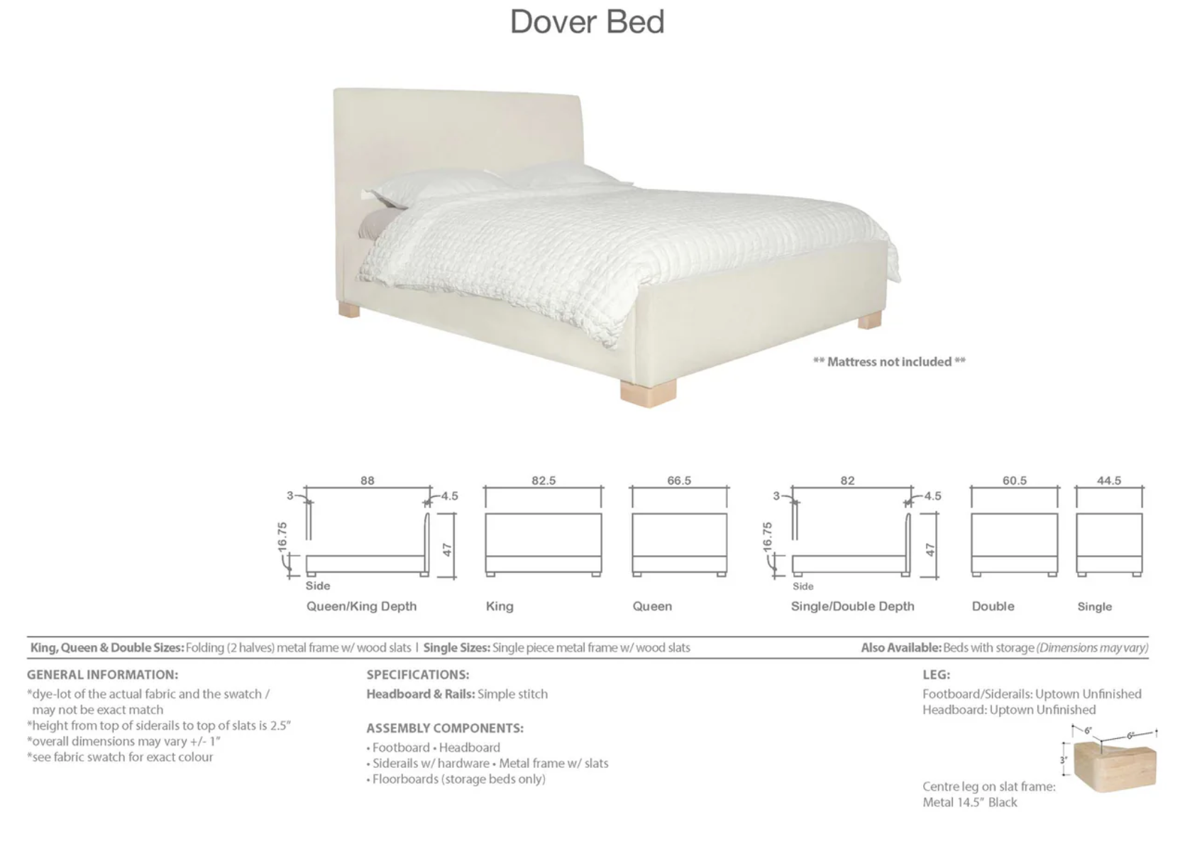 Assembly Components: Footboard, headboard, siderails w/ hardware, metal frame w/ slats, legs.
