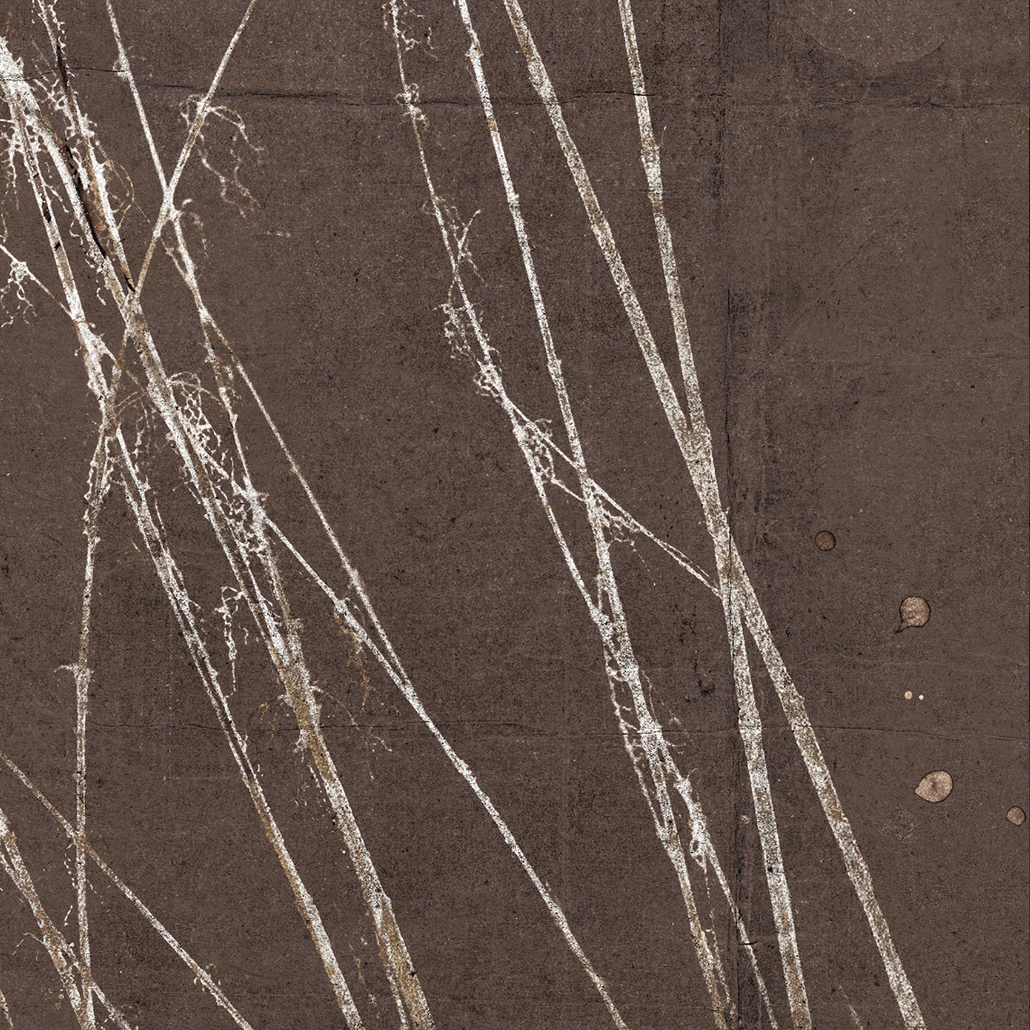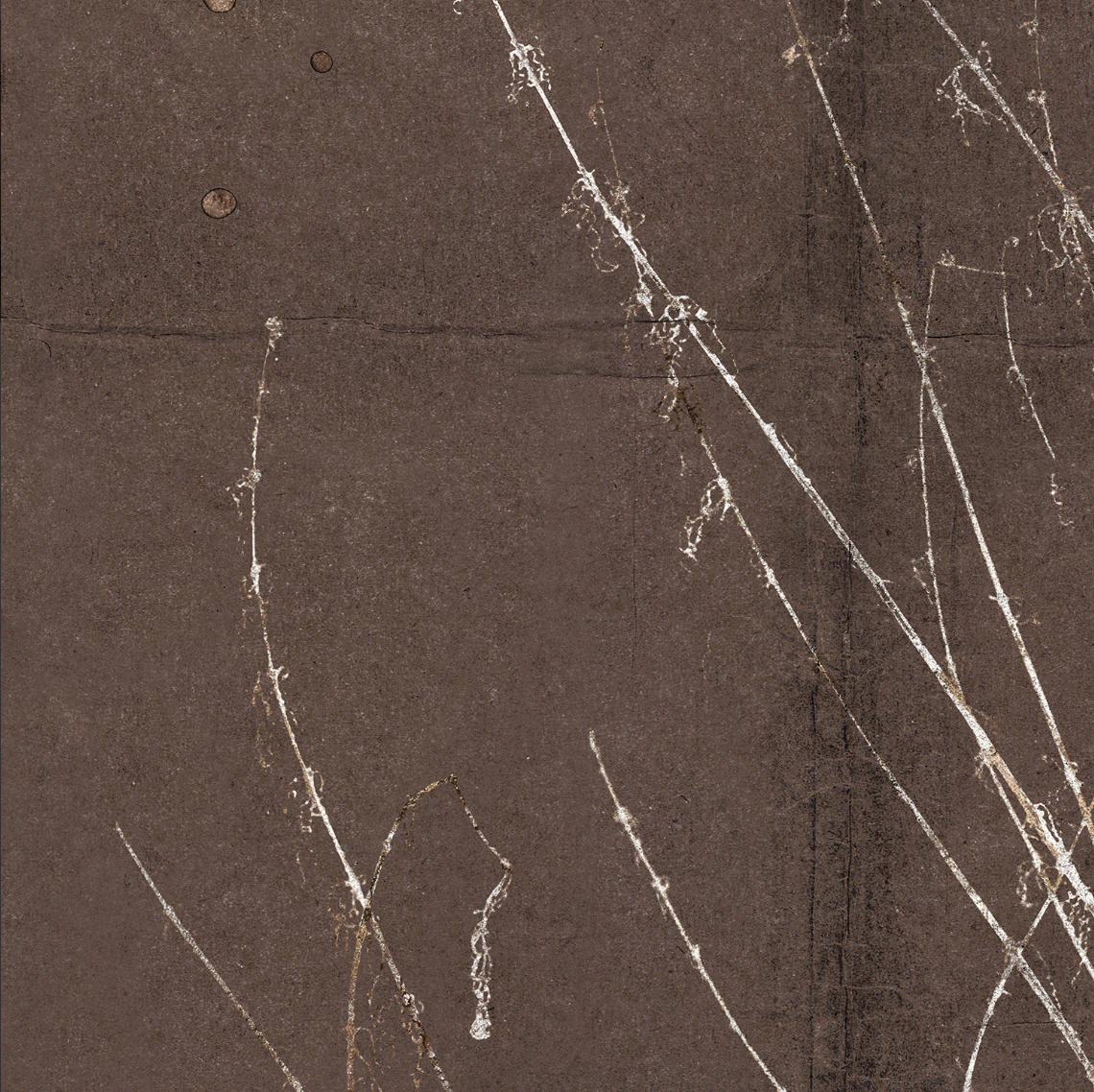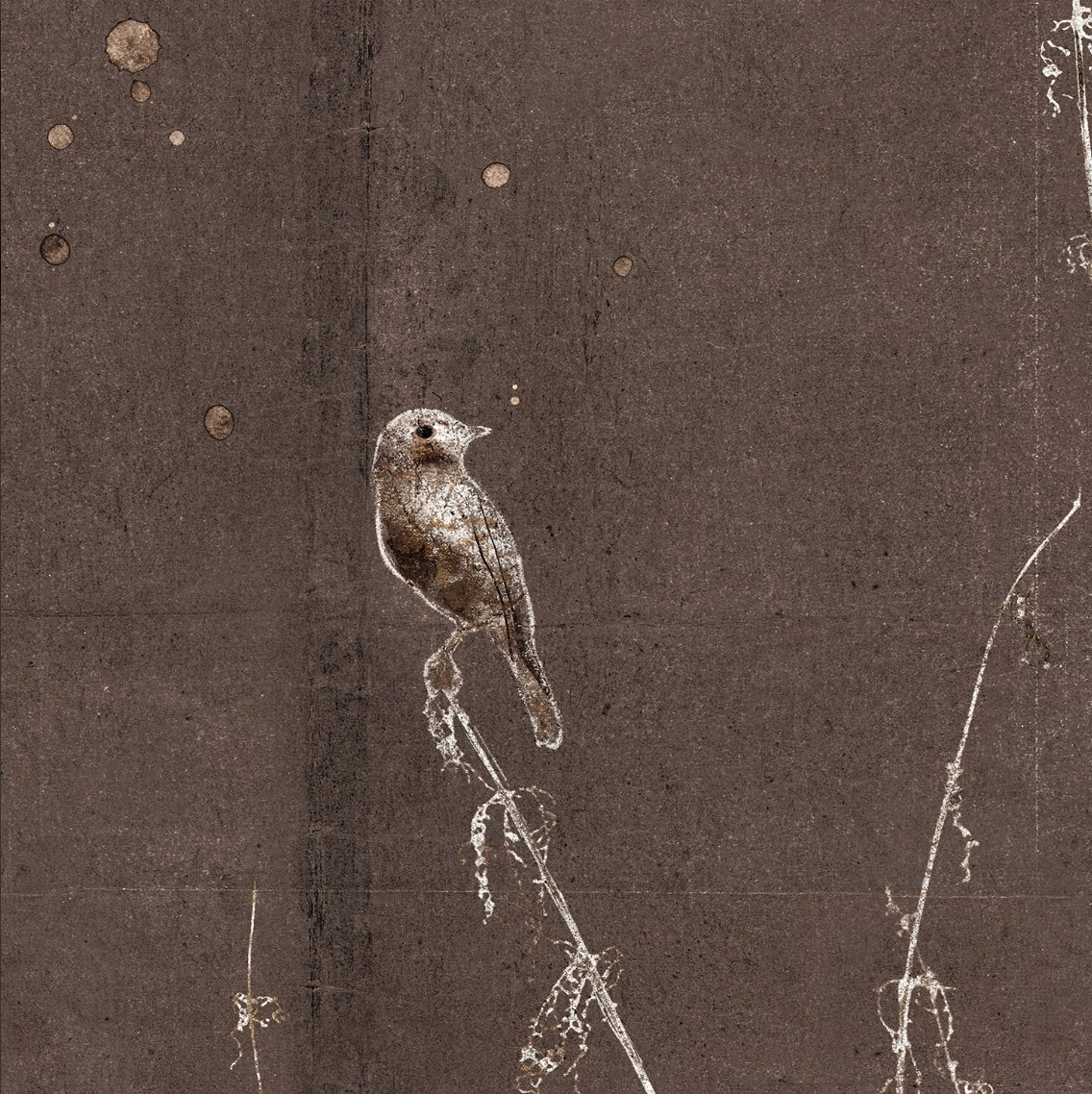 The delicate lines and use of negative space in this print highlight the ephemeral nature of the moment captured within. Thin lines of white and cream outline the shapes of birds and foliage in a variety of settings, standing out against varying shades of brown, creased paper backgrounds.