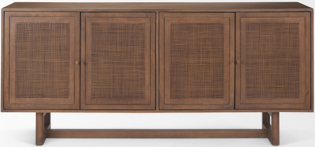 The Grier Sideboard is a mango wood and finished with four cabinet doors that feature a cane lattice door front.