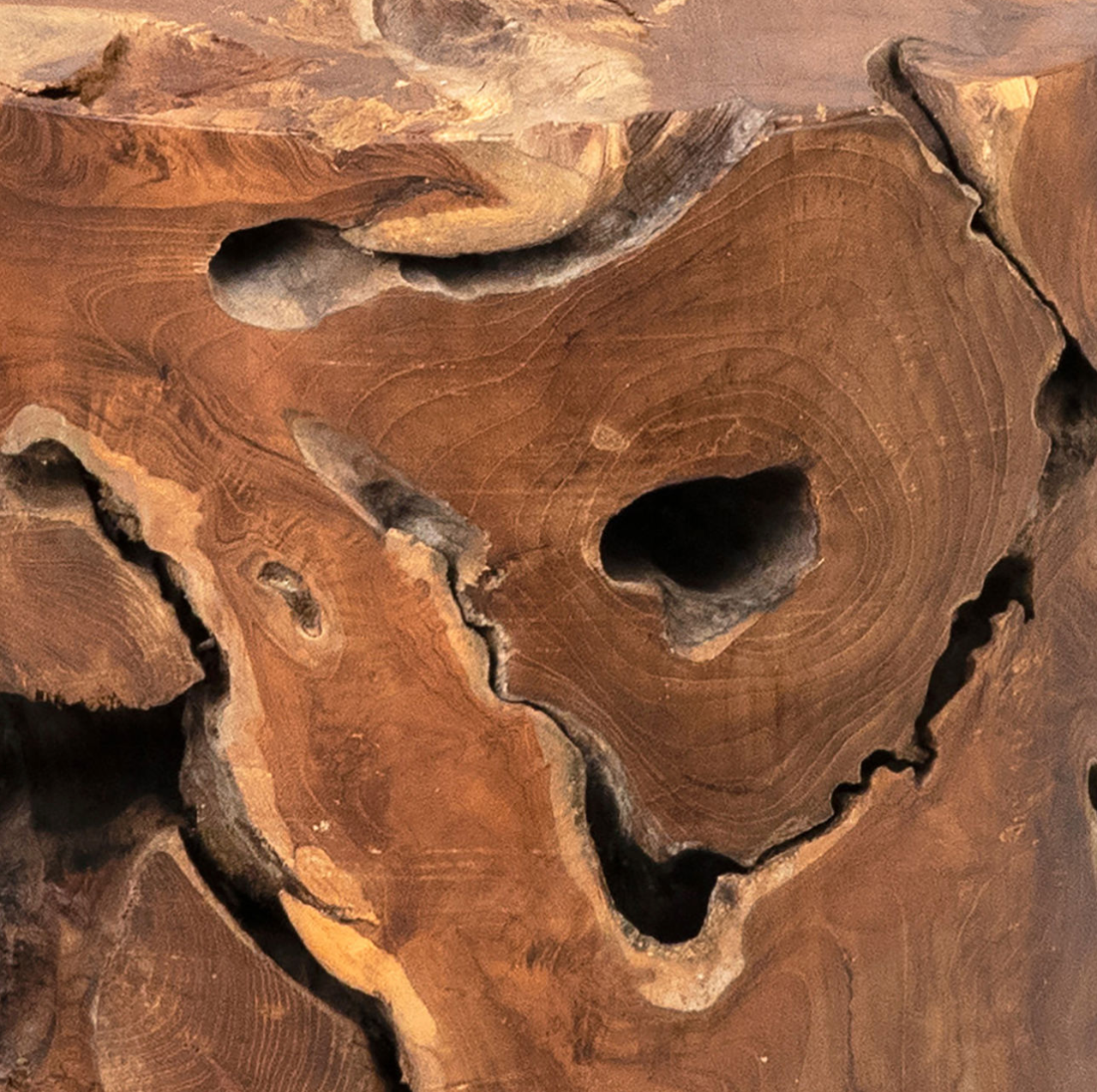 Made from reclaimed teak roots in an antique wood finish.