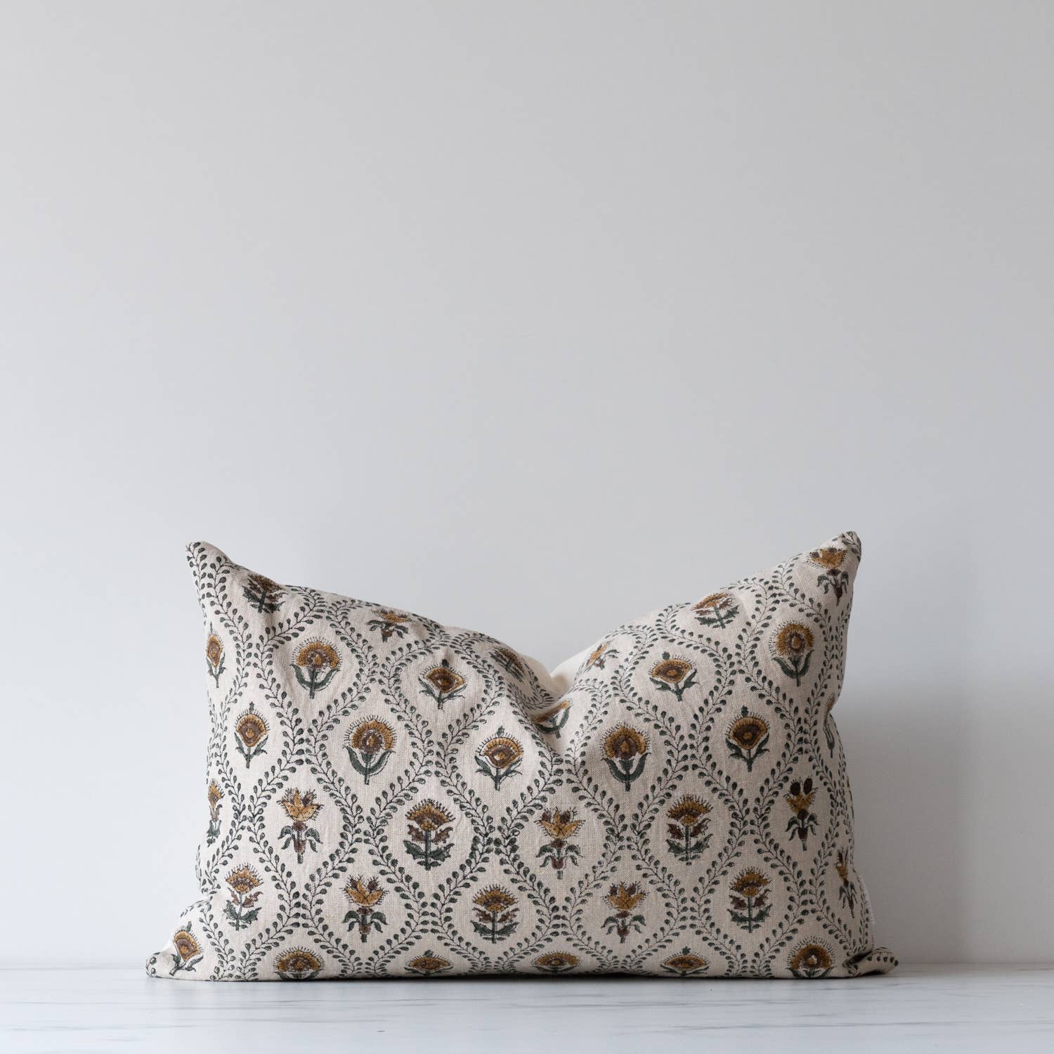 A new botanical block print, featuring swirling green vines on a neutral beige linen with a rustic quality and texture. This eye-catching motif stands out in any space adding cottage core charm and hand made artistry all at once. Hand block printed in India, this textile is truly unique and representative of hundreds of years of tradition and skill.