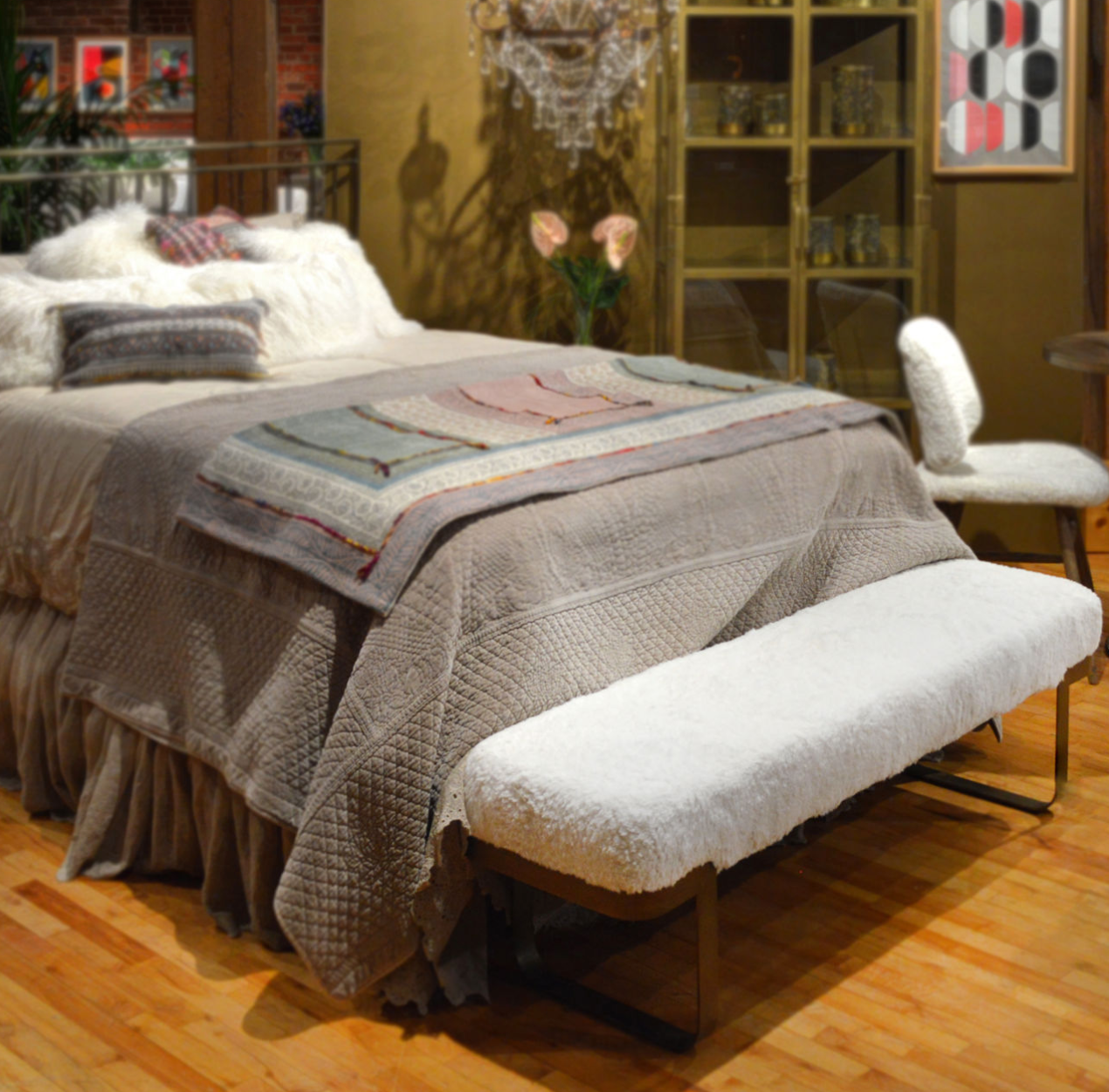 This chic plush bench is made from a soft and plush sherpa upholstery in a natural white and beautifully accented with antiqued brass finished steel legs. Perfect to be used from entry ways to bedrooms.