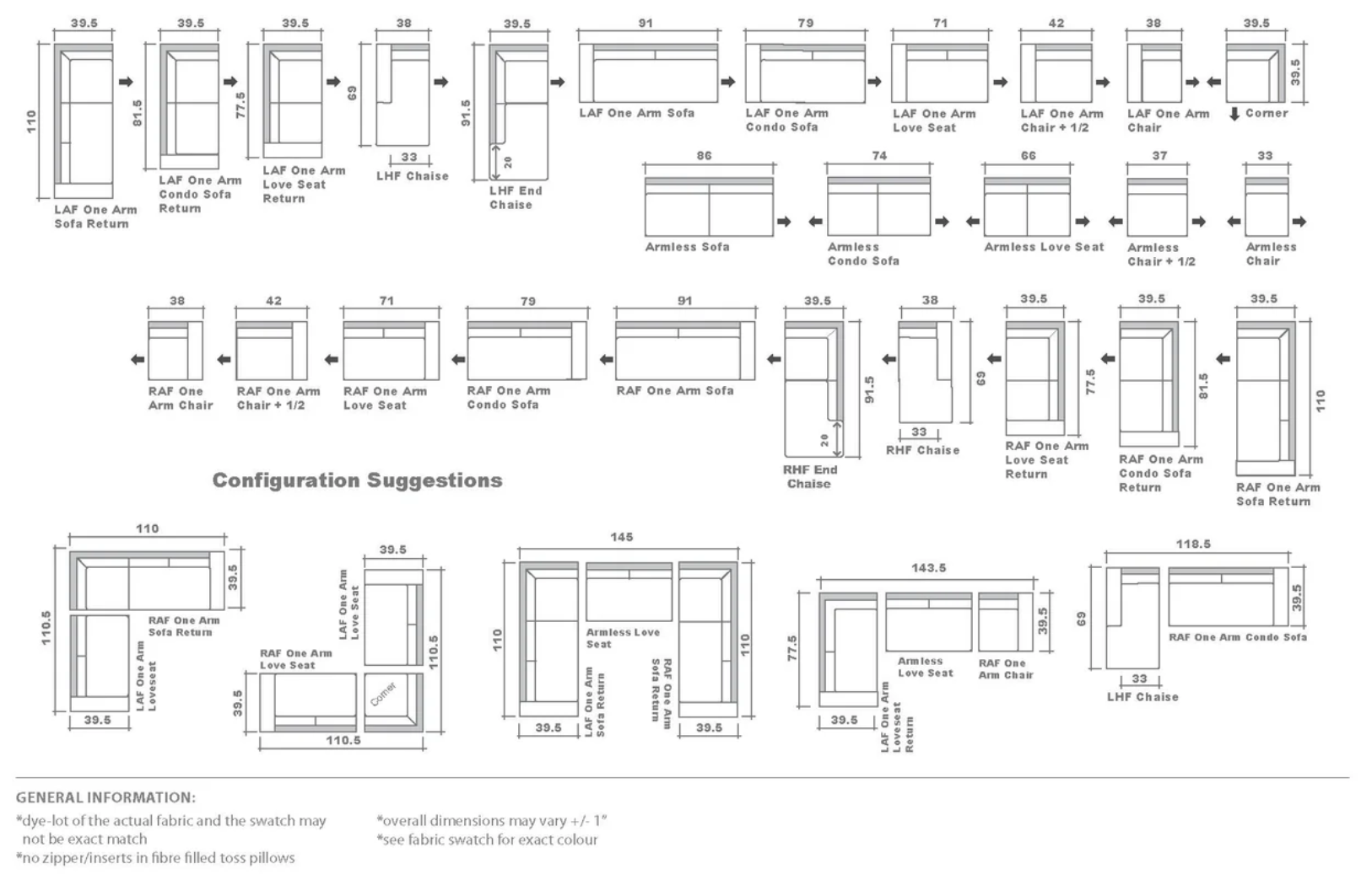 - 2 Piece Sectional - right arm facing one arm sofa return, left arm facing one arm loveseat: 110" x 110.5" x 35.5".