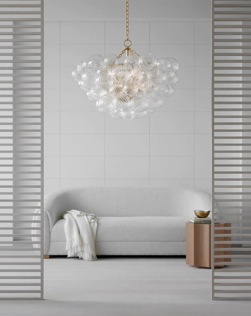 Artisanal glass elevates the Talia series for a new take on the simple glass globe light fixture. Light shimmers through multiple swirled glass orbs attached to metal baskets, creating a whimsical flourish. Available in a range of sizes and configurations, the Talia series adds a dynamic mix of sparkling glass, rounded forms, and bright metals to any interior. Choose a chandelier for entryways and dining areas, flush-mounts or wall sconces for living spaces or bedrooms, and add a playful, feminine touch to any space.
