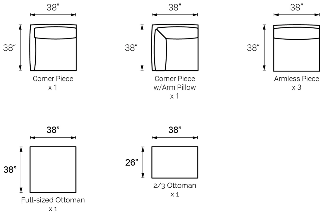 - 5 Piece (w/ Ottoman): 2 comfort-inducing corner elements (1 with an arm pillow included), 2 armless elements to add length where needed, and 1 full-size ottoman for versatile surface space.