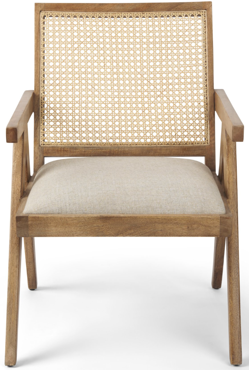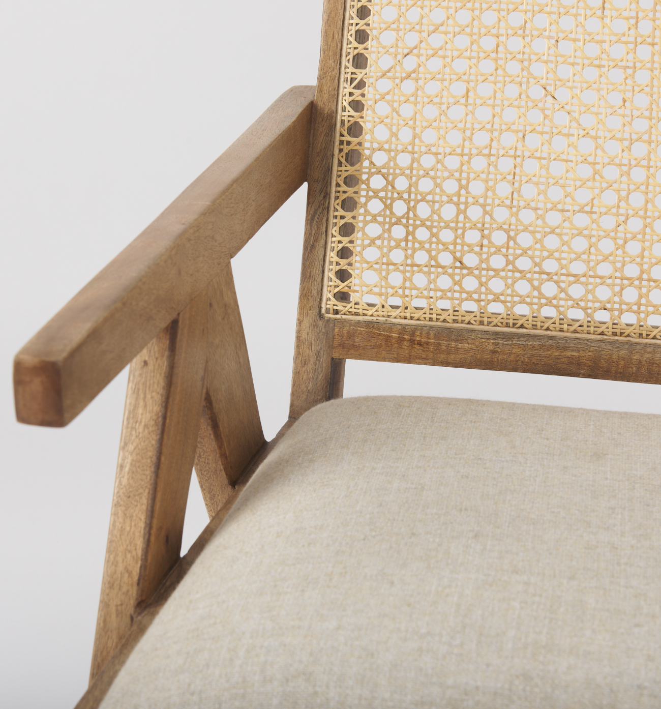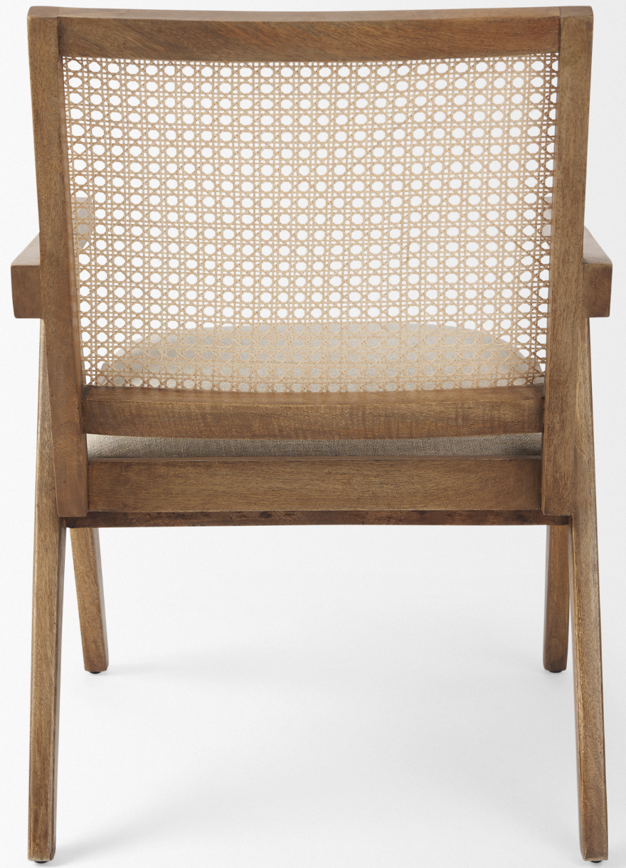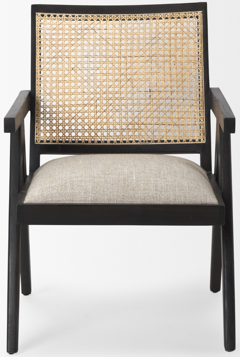 The Donna Accent Chair is ideal for those wanting to accentuate a relaxed, yet modern design aesthetic. Take note of the chair’s mid-century inspired clean lines and sleek silhouette. This chair is crafted from light brown or black finished solid wood and features a beautiful cane mesh backrest. The contemporary light beige linen fabric covered padded seat cushion and slightly reclined seatback makes it a chair that doesn't compromise on comfort.