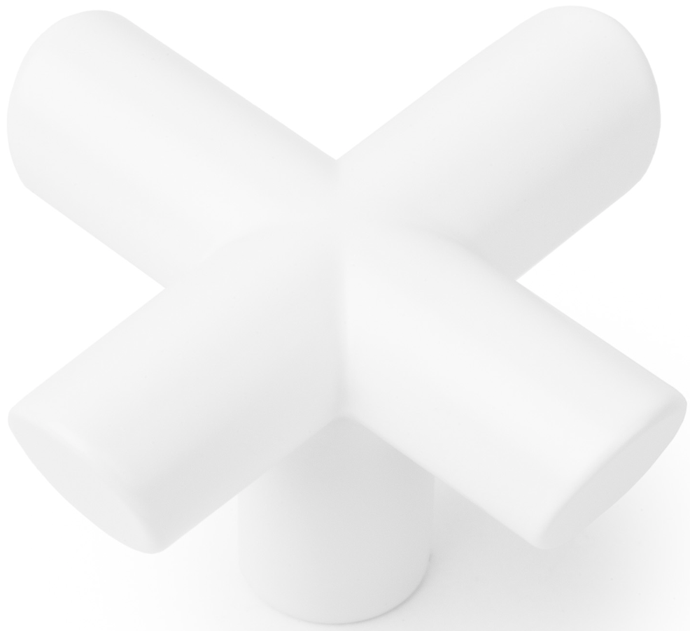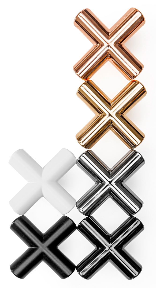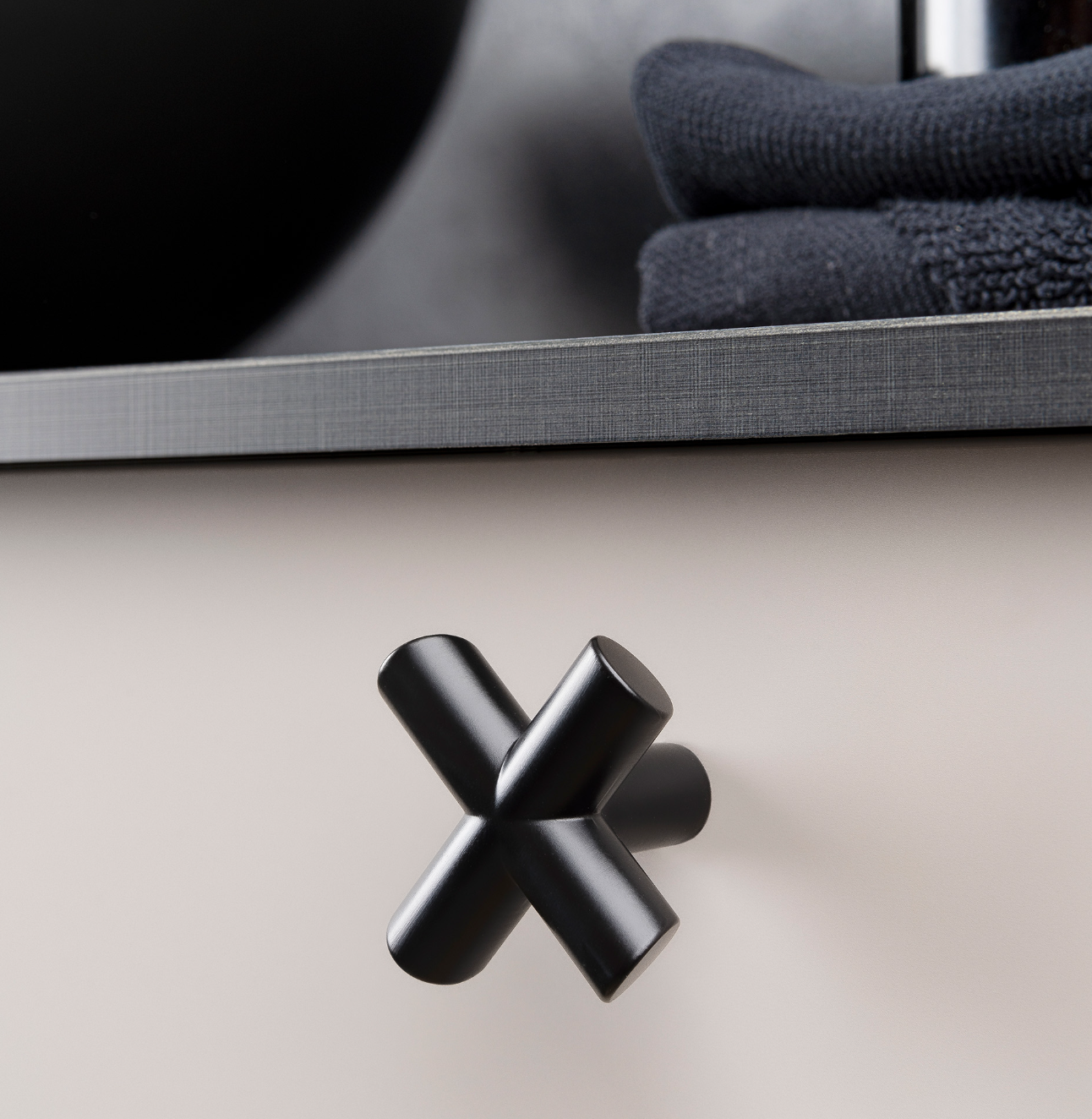 The cross shaped design of the Evan knob is a reinterpretation of the classic industrial tap design.