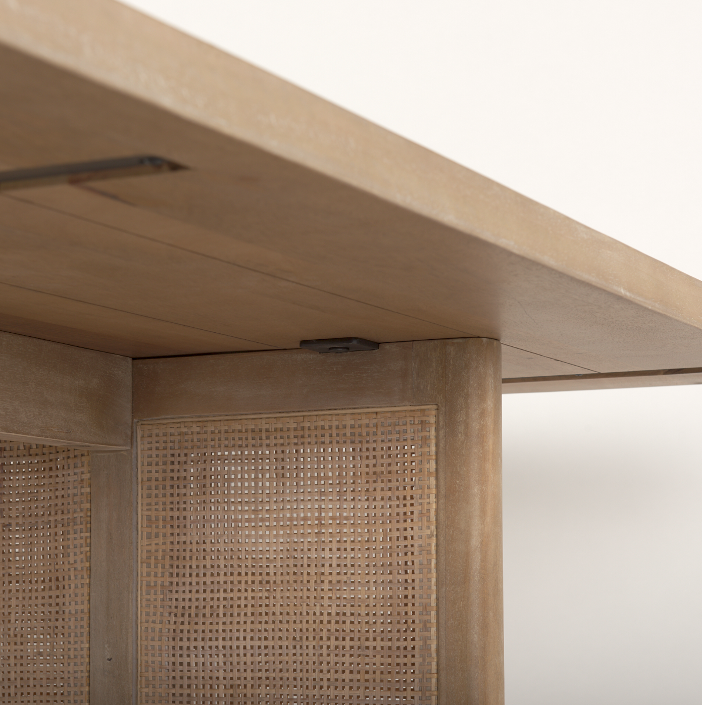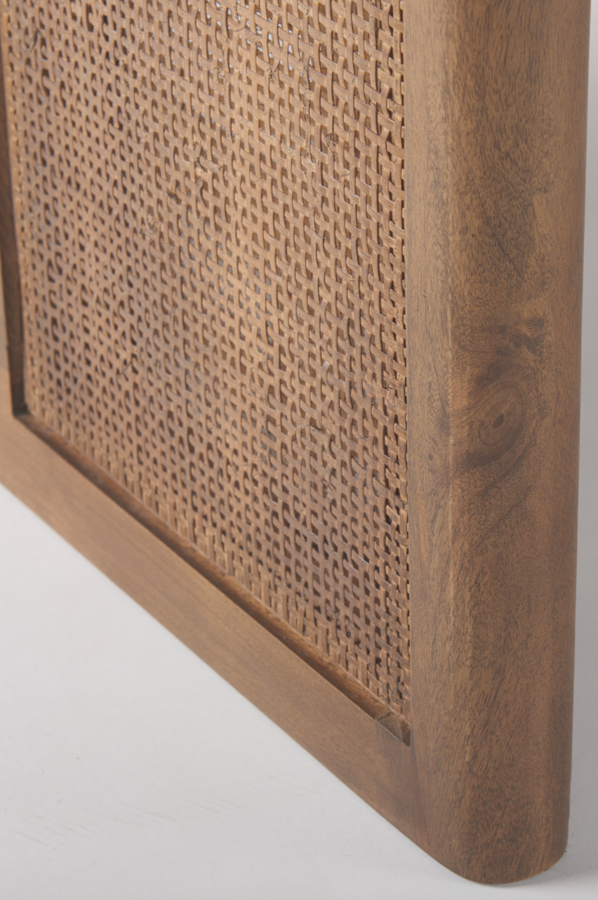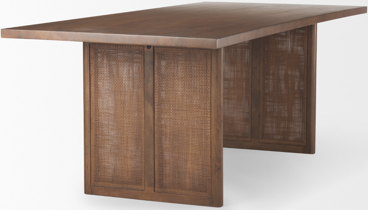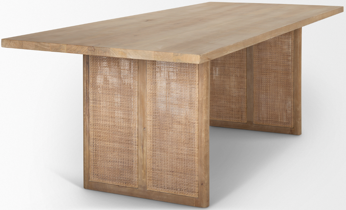 Sleekly crafted from solid Mango wood and finished with classic cane details, the Grier Dining Table brings a sense of relaxed sophistication to contemporary living spaces. This beautiful, Mediterranean-inspired table will make a statement for years to come, acting as a stylish setting for entertaining. The thick square top, set upon two slab legs, is eye-catching with warm wood tones and natural variations. This table can be combined with other pieces within the Grier Collection to complete the look.