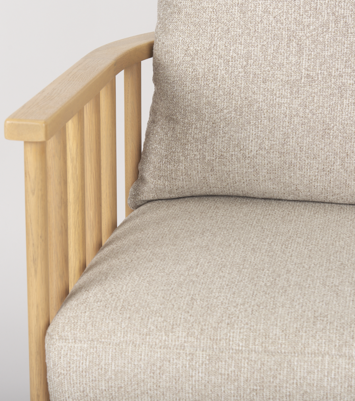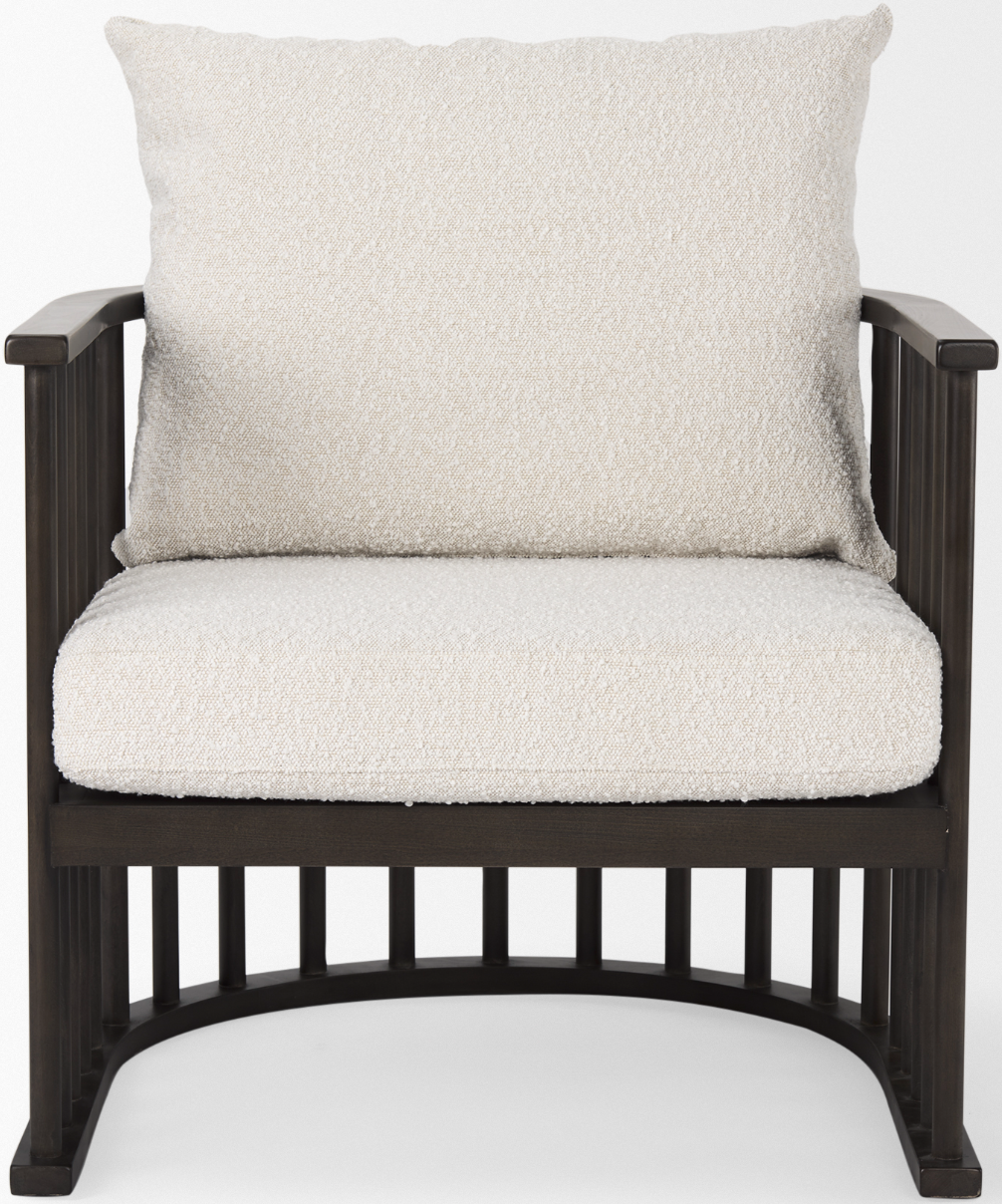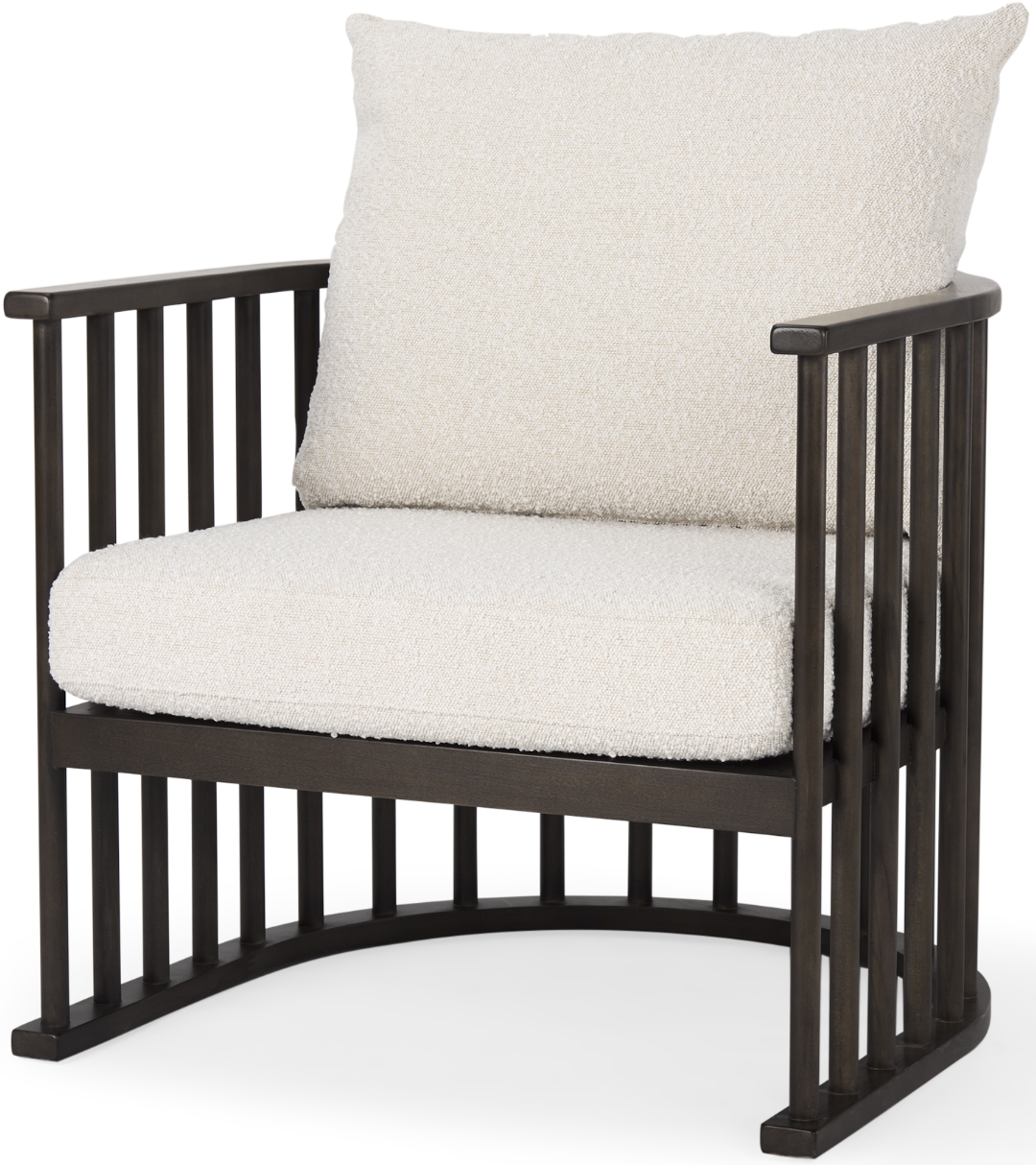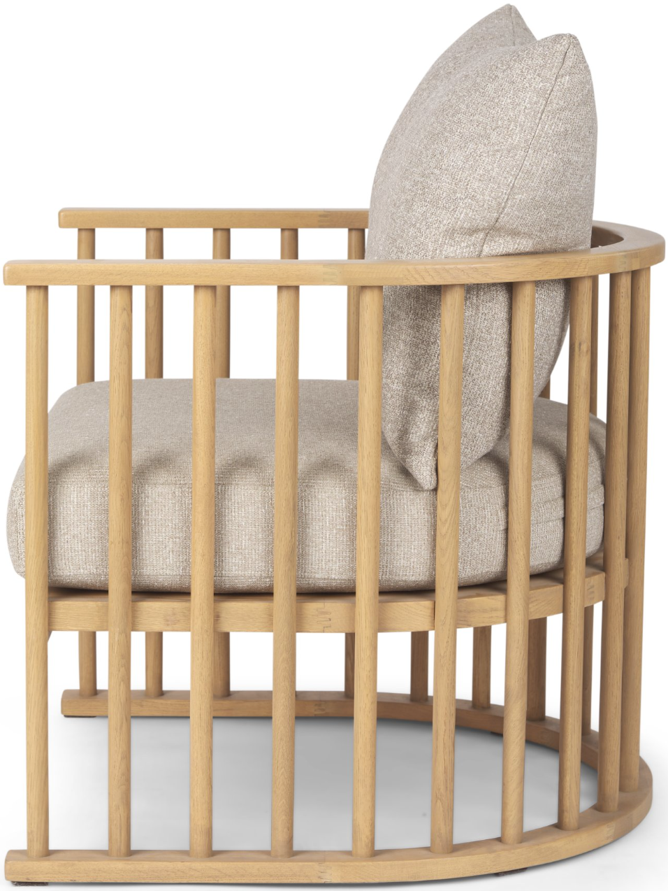 The Kopari accent chair stylishly combines beige tweed fabric with light wood or a luxurious bouclé fabric with solid wood. This relaxed modern accent chair features a desirable cushioned seat and backing enveloped in a unique barred and arched frame.