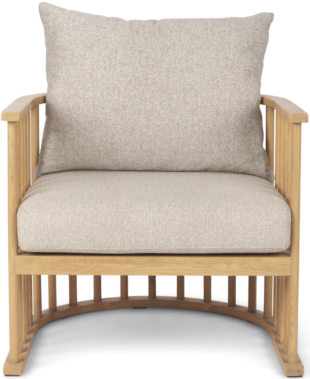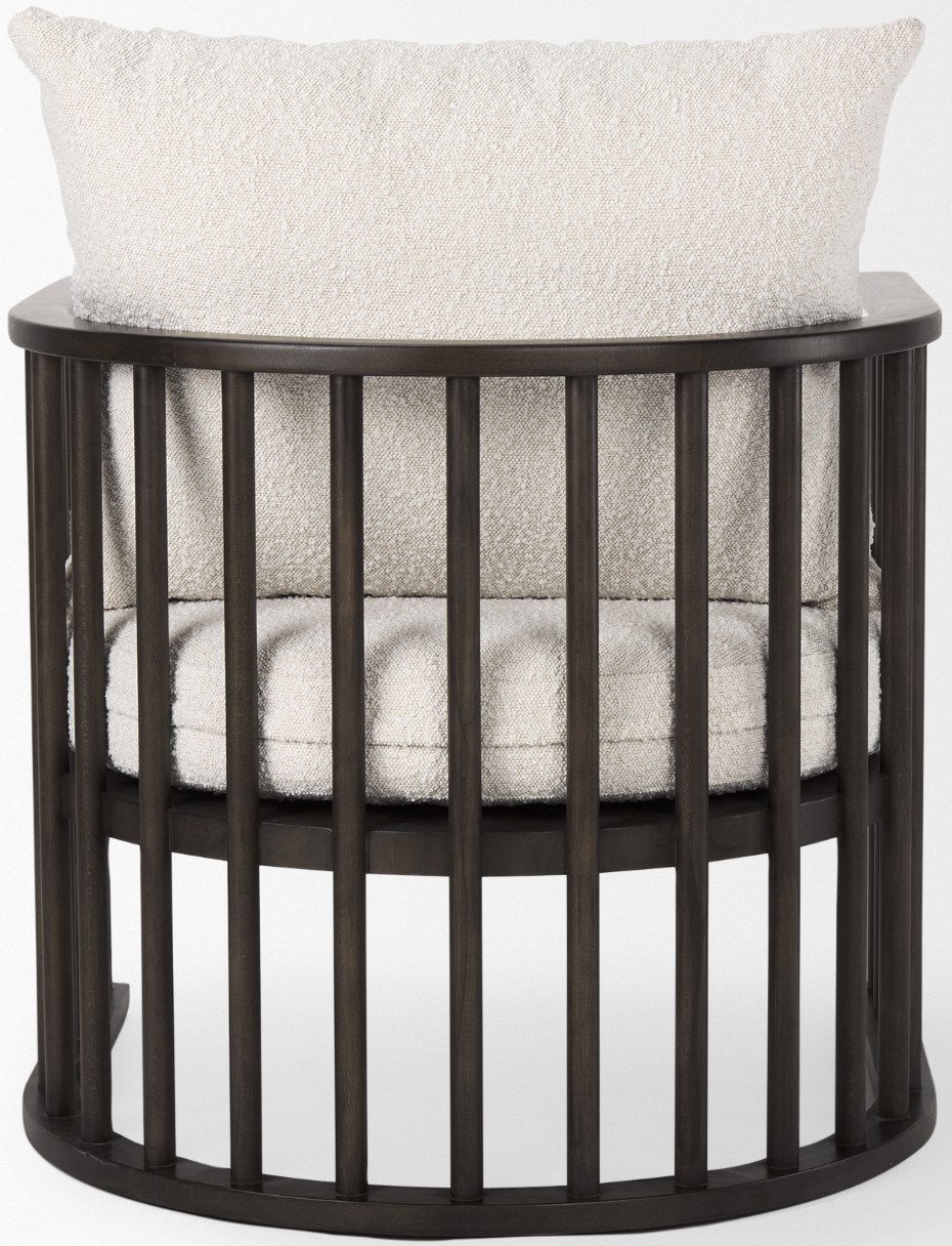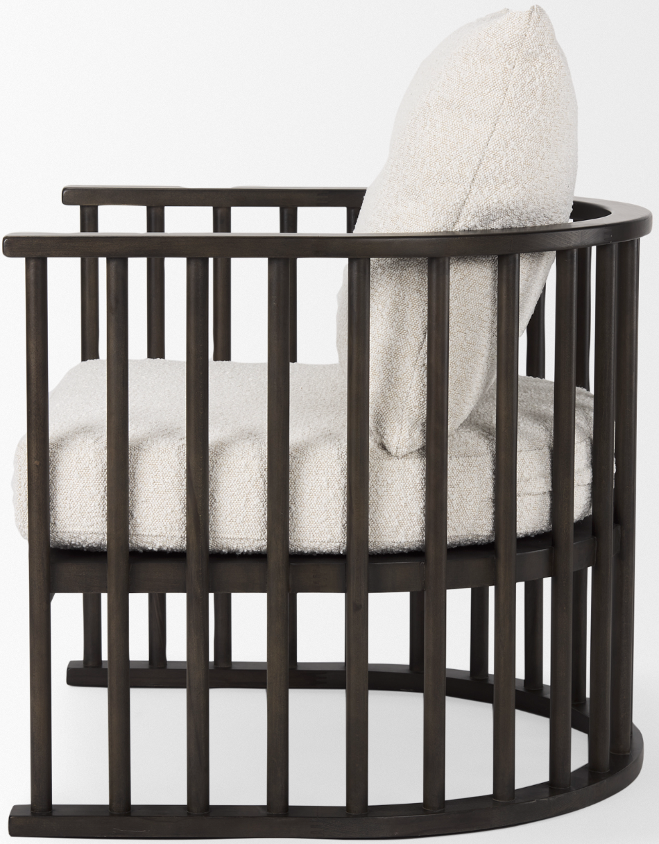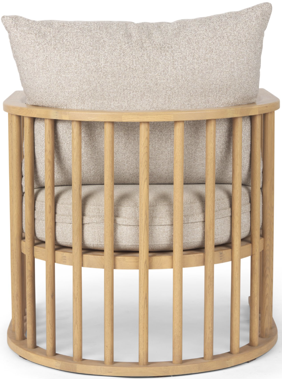 The Kopari accent chair stylishly combines beige tweed fabric with light wood or a luxurious bouclé fabric with solid wood. This relaxed modern accent chair features a desirable cushioned seat and backing enveloped in a unique barred and arched frame.