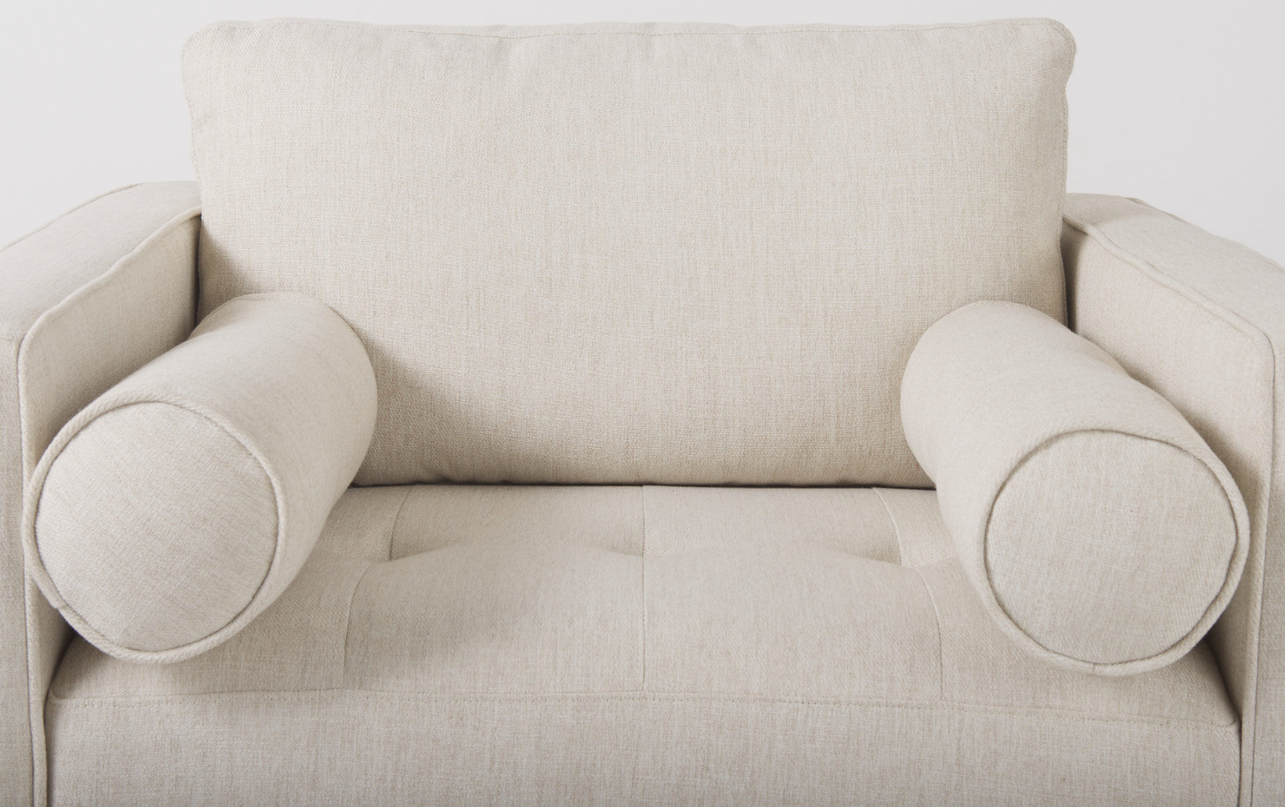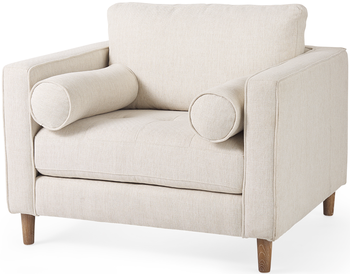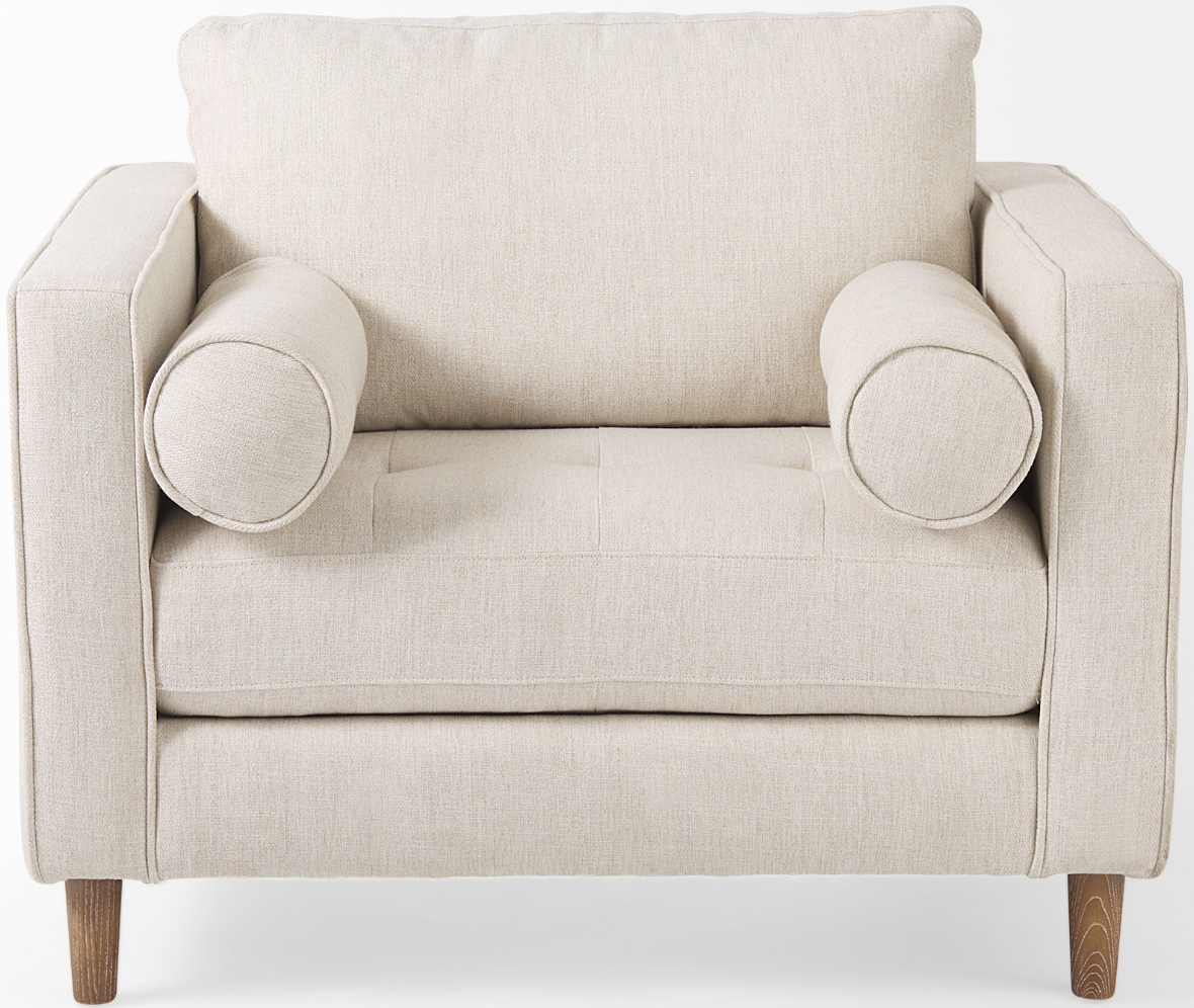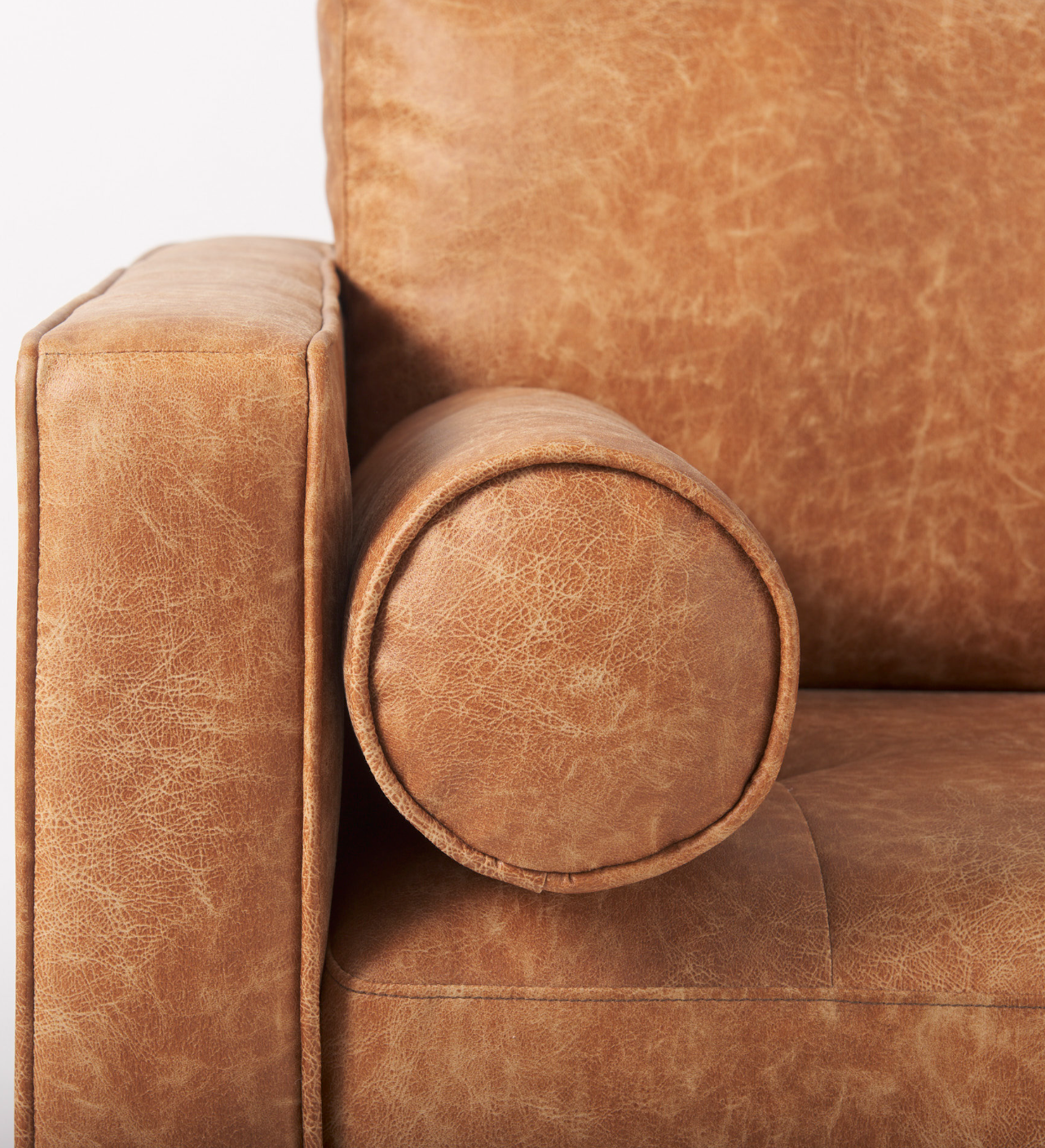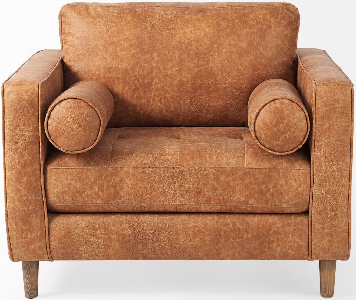 The Loretta is wrapped in faux cognac brown leather or cream upholstered fabric, and offers unparalleled comfort and is guaranteed to have you lounging for hours. The Loretta is braced by four solid wood legs that ensure exceptional stability and sturdiness and two matching bolster pillows. The Loretta arm chair can be paired with the Loretta sofa to complete the look, making any living room look put together and luxurious. The Loretta looks gorgeous in any modern space and setting and is guaranteed to add a touch of luxury to your space without compromising on comfort.