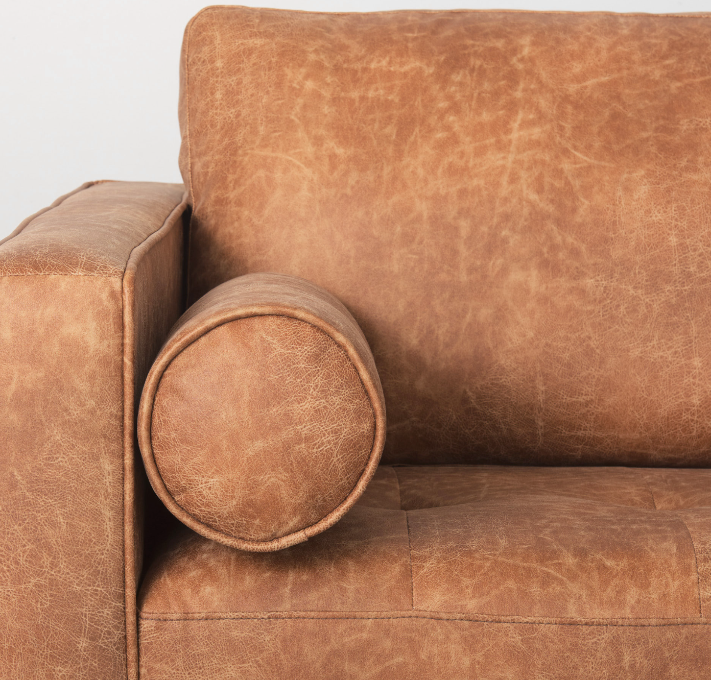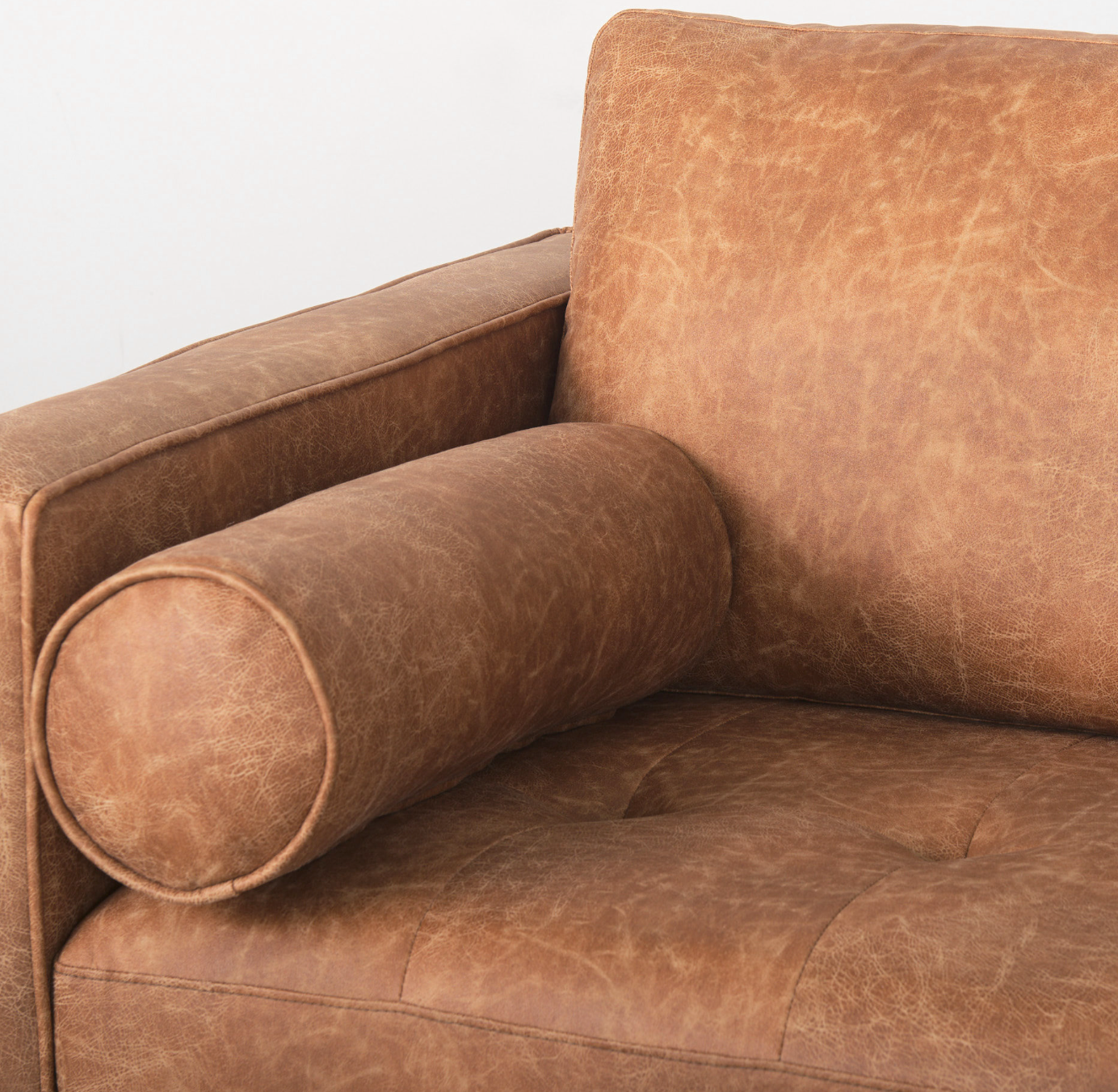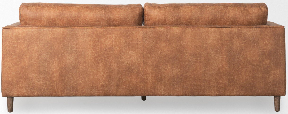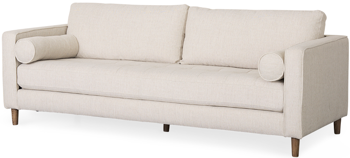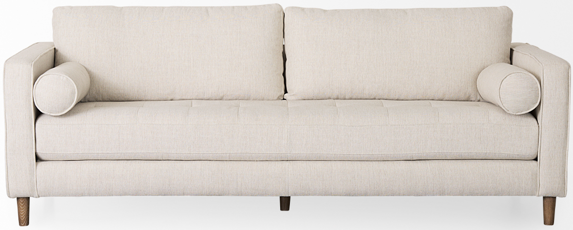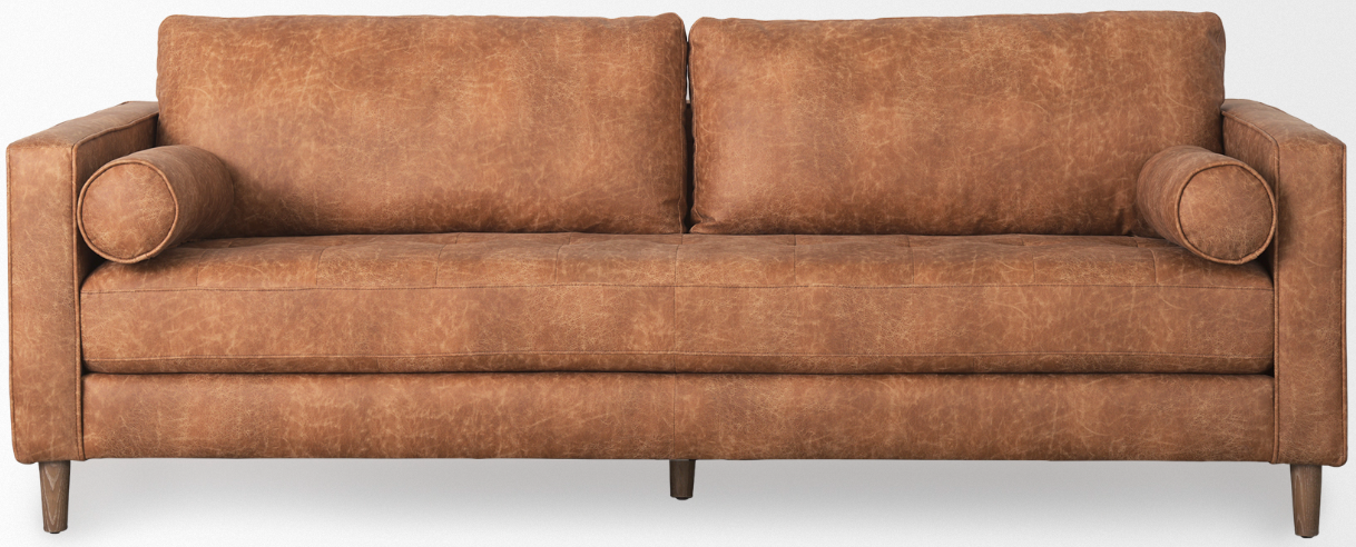 The Loretta is wrapped in faux cognac brown leather or cream upholstered fabric, and offers unparalleled comfort and is guaranteed to have you lounging for hours. The sofa is finished with medium brown wooden legs, and two matching bolster pillows. The Loretta is braced by four solid wood legs that ensure exceptional stability and sturdiness. The Loretta looks gorgeous in any modern space and setting and is guaranteed to add a touch of luxury to your space without compromising on comfort.