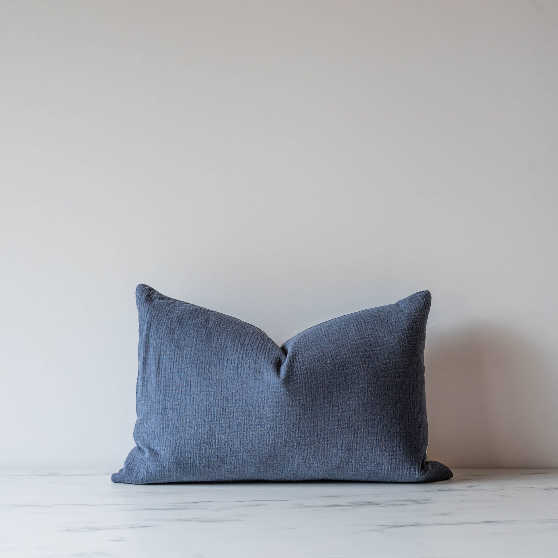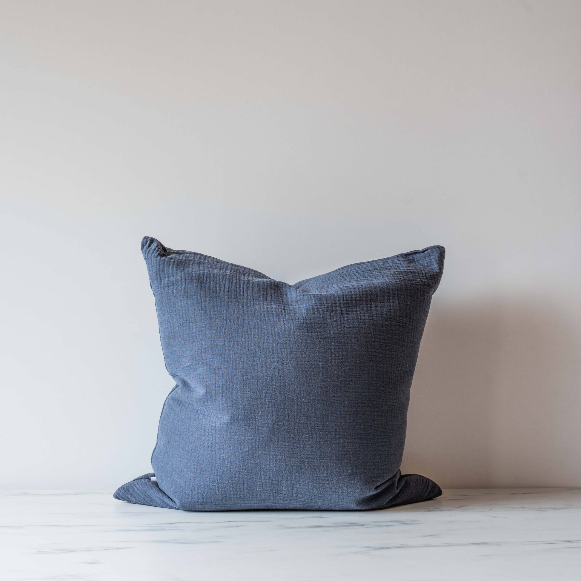 Soft 100% organic cotton double gauze in a stormy grey blue featuring a subtle crinkle make this pillow an easy way to add texture and colour to any living space. Double sided for that perfectly cozy feel.