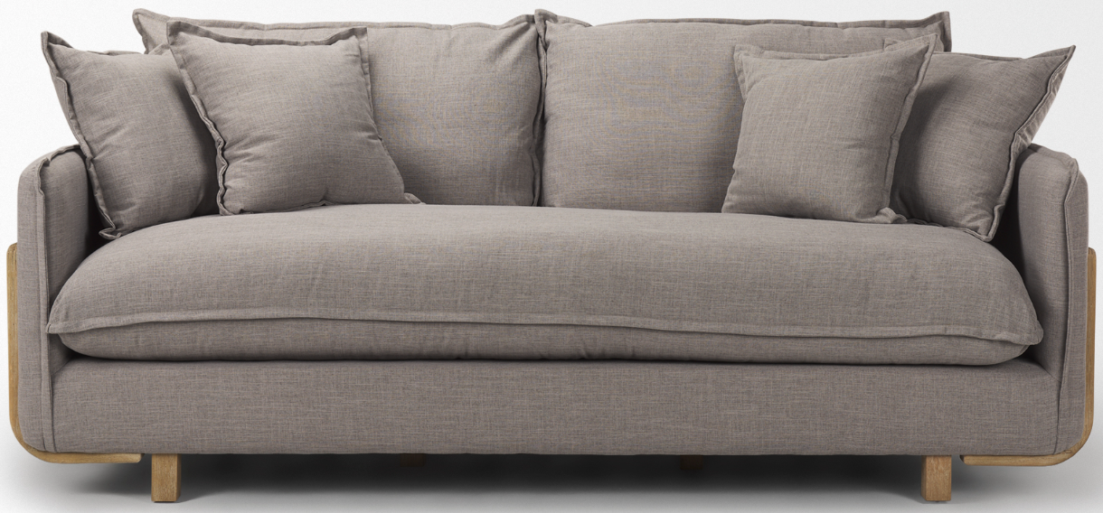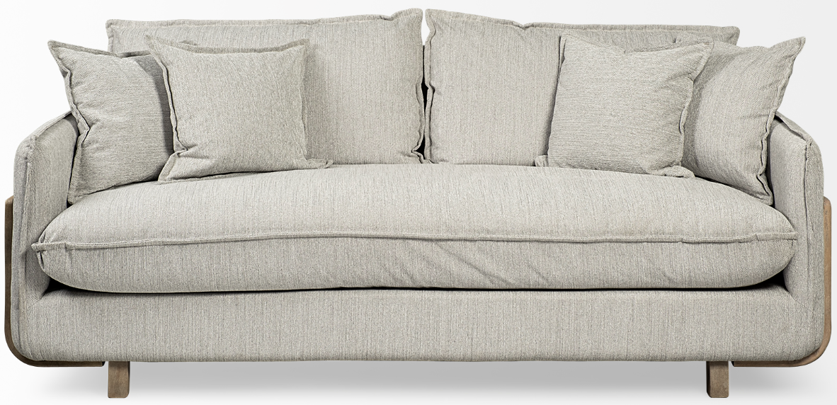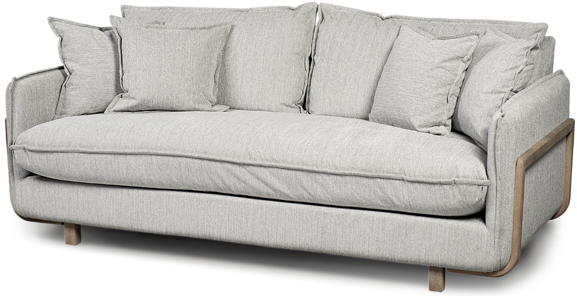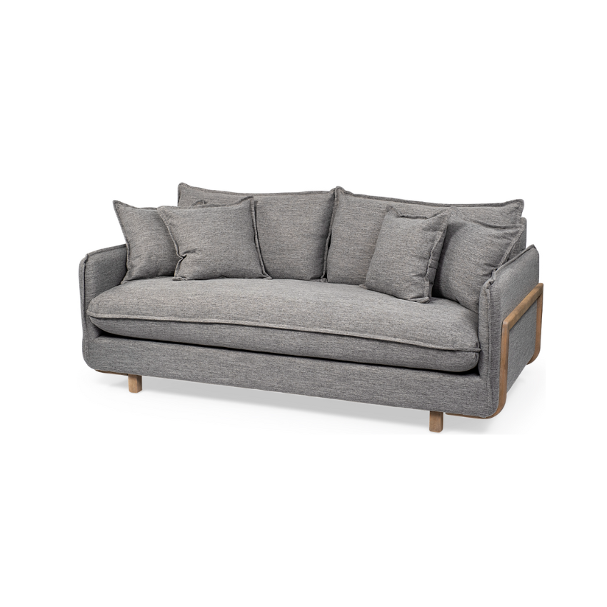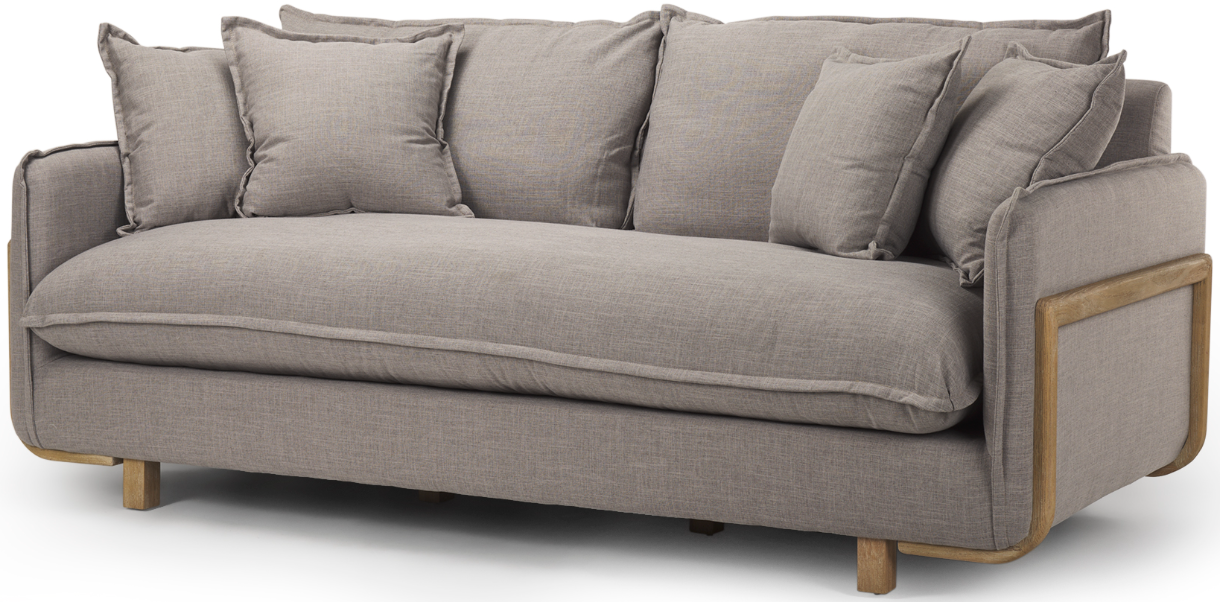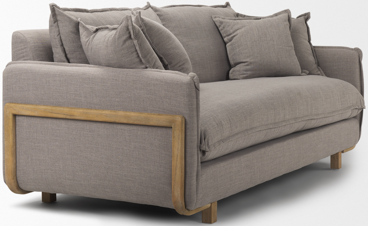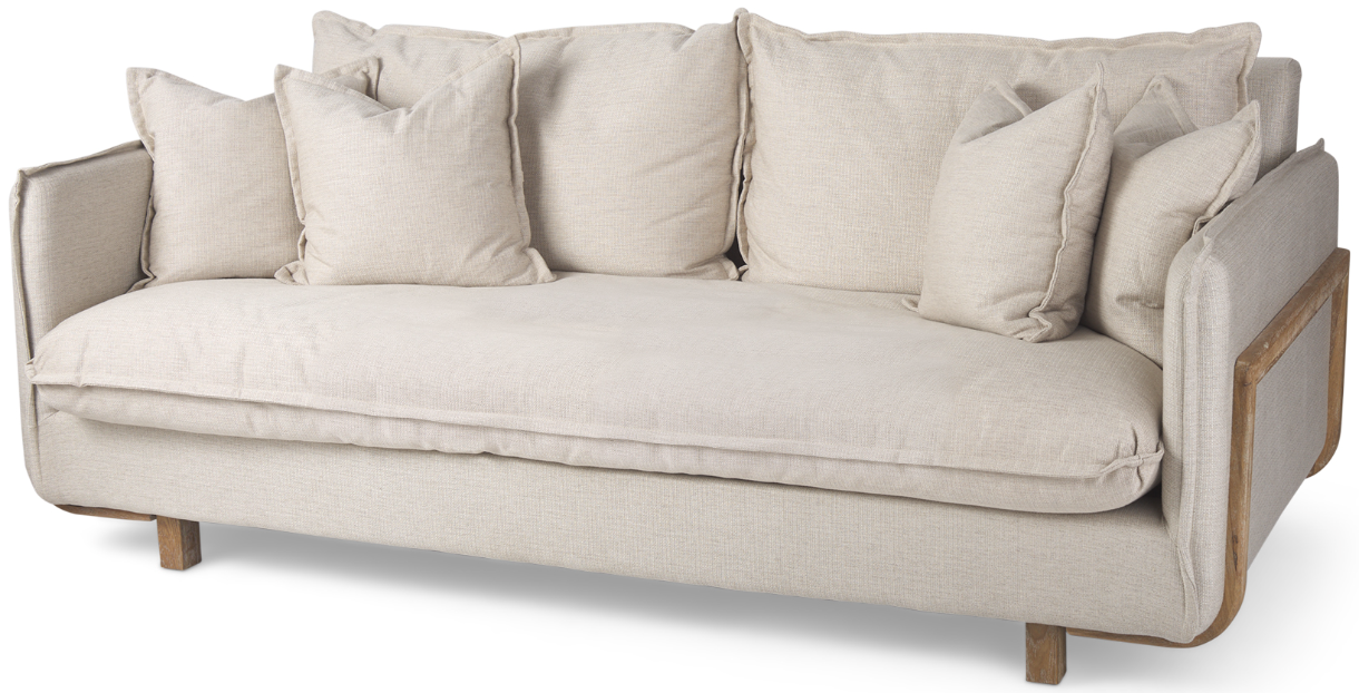 Crafted from solid wood, the Roy sofa is a spectacular, upholstered sofa that comfortably seats three. Featuring an exceptionally durable and sturdy four-legged mango wood frame finished in a natural brown polish, the Roy boasts of plush, fabric wrapped seating that is not only comfortable but also complements the wooden components of this ritzy sofa. Equipped with two detachable back cushions and four matching throw pillows that add to its luxurious seating experience, the Roy makes for the perfect addition to modern, farmhouse and coastal design styles.