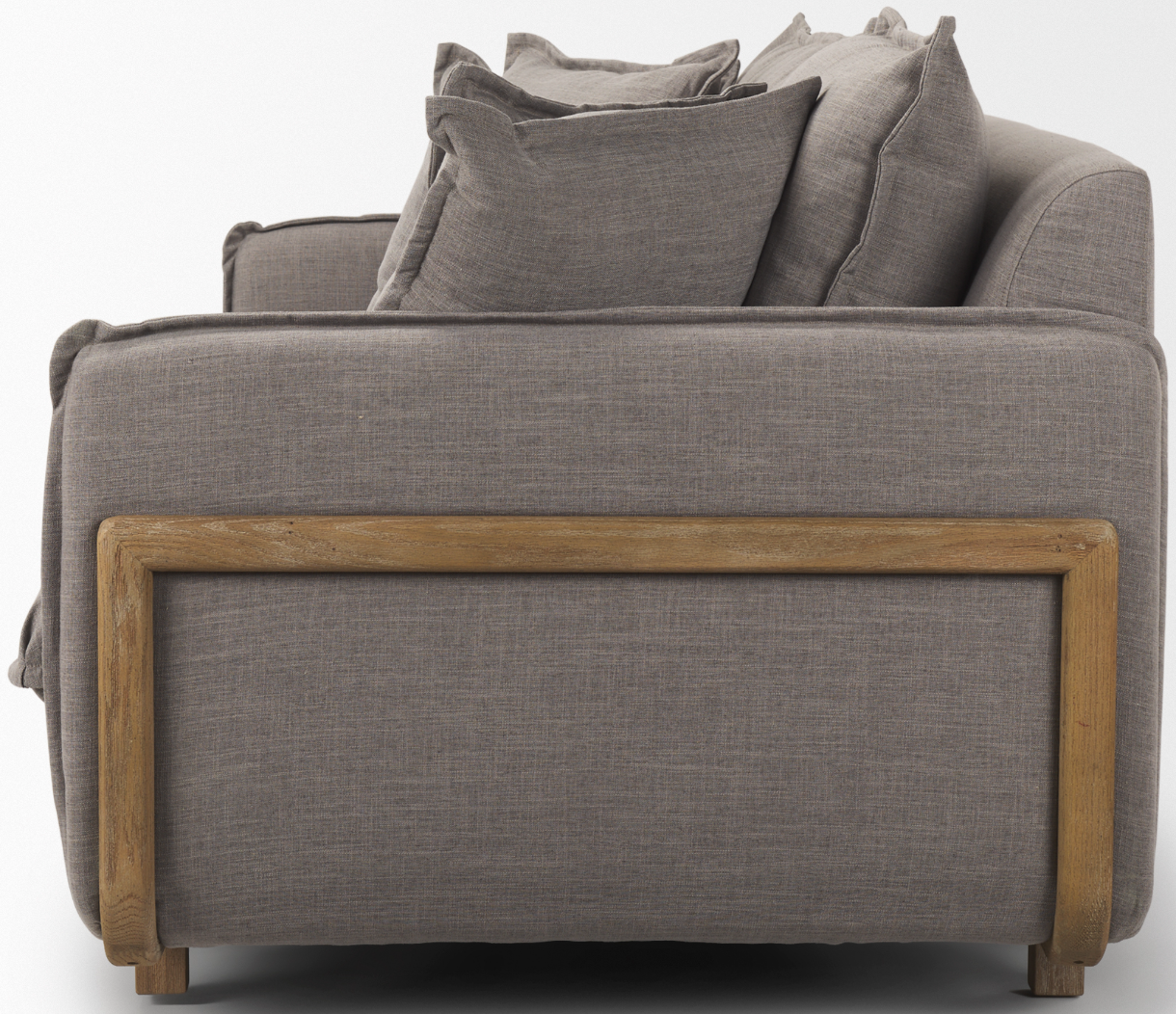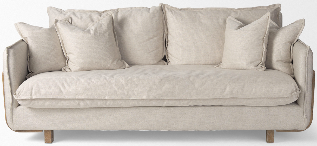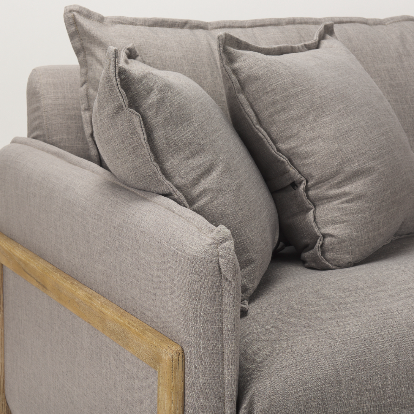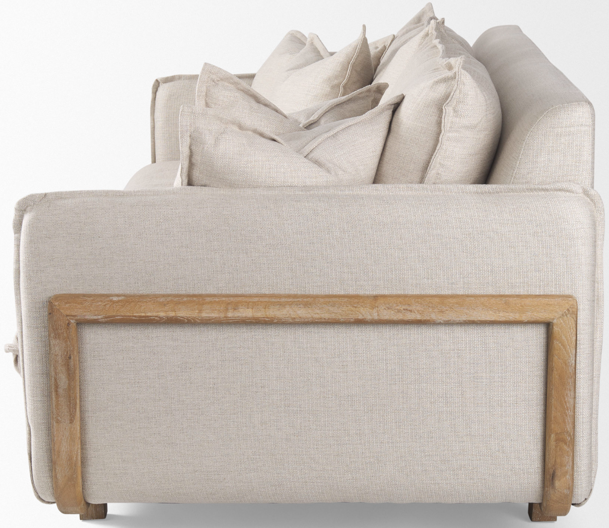 Crafted from solid wood, the Roy sofa is a spectacular, upholstered sofa that comfortably seats three. Featuring an exceptionally durable and sturdy four-legged mango wood frame finished in a natural brown polish, the Roy boasts of plush, fabric wrapped seating that is not only comfortable but also complements the wooden components of this ritzy sofa. Equipped with two detachable back cushions and four matching throw pillows that add to its luxurious seating experience, the Roy makes for the perfect addition to modern, farmhouse and coastal design styles.