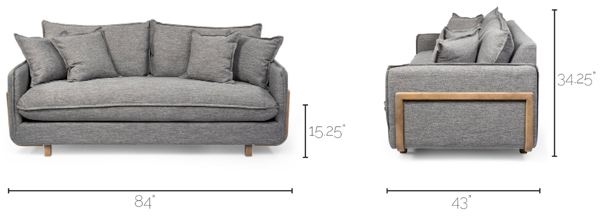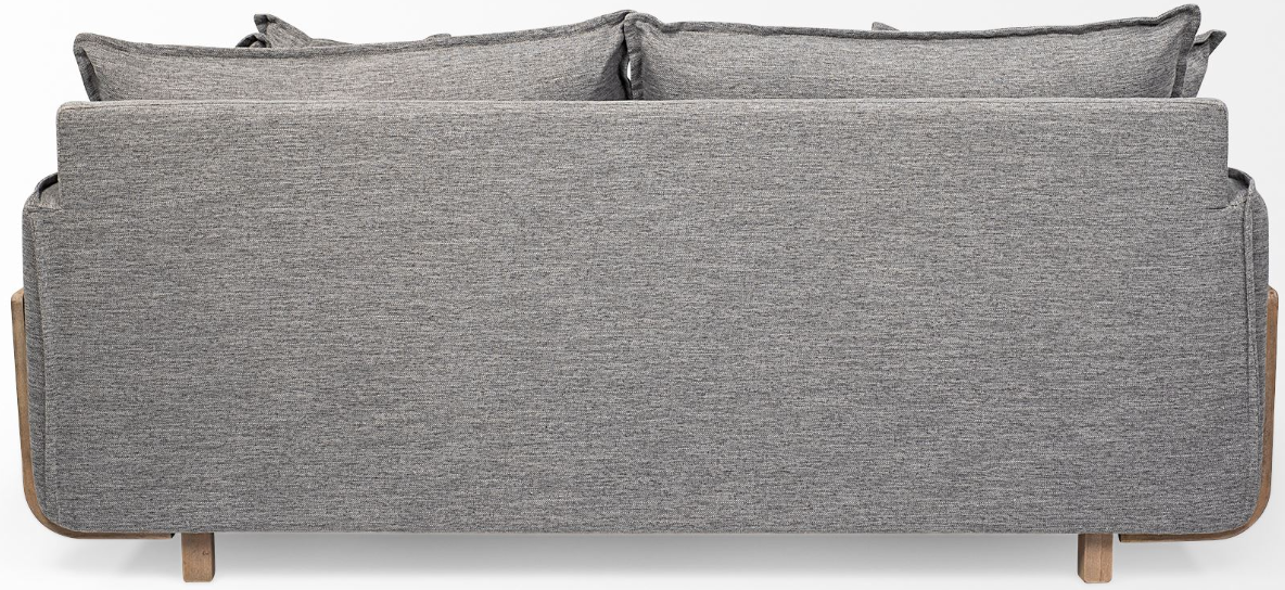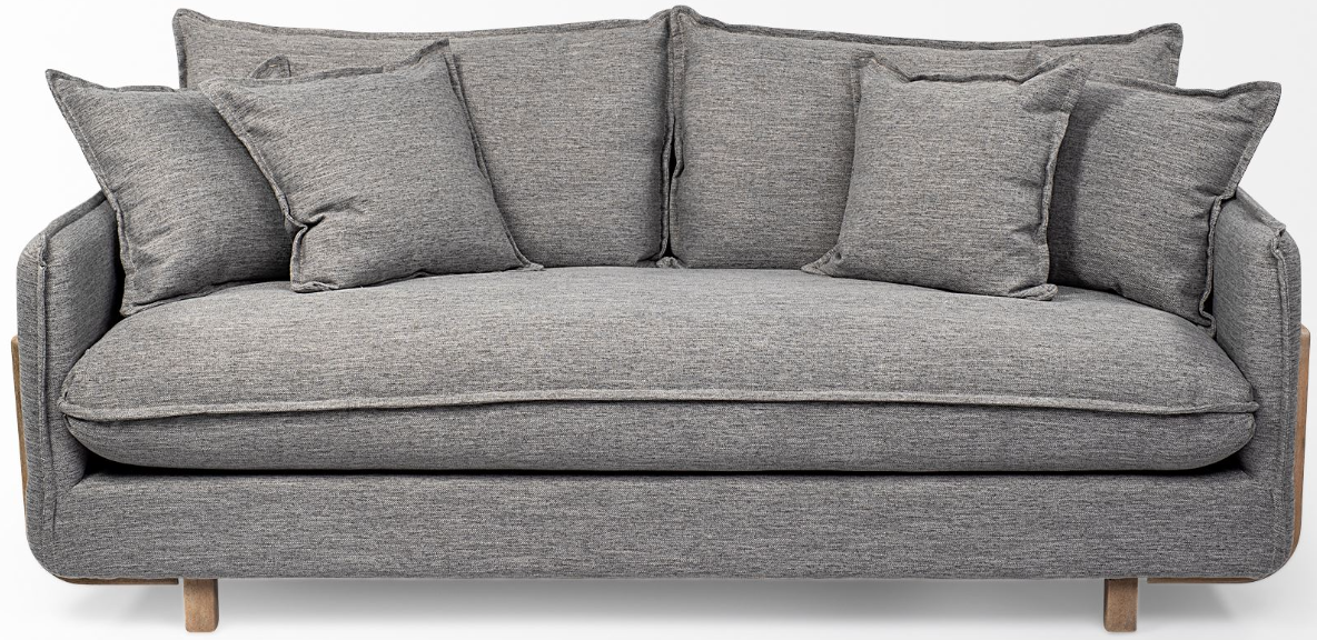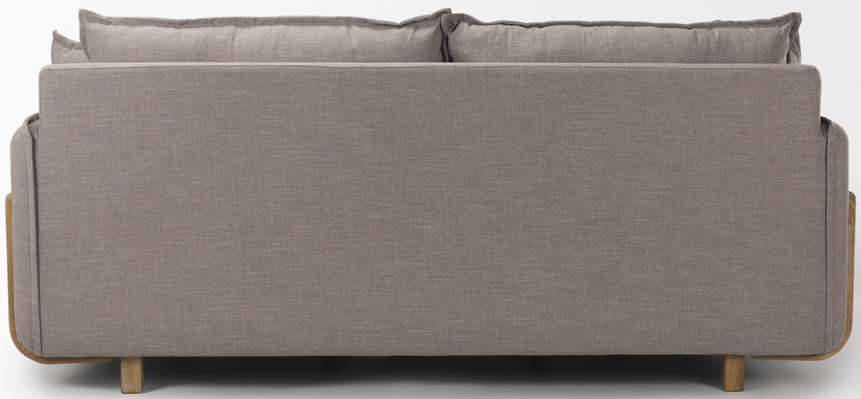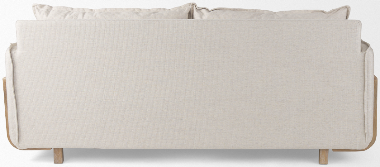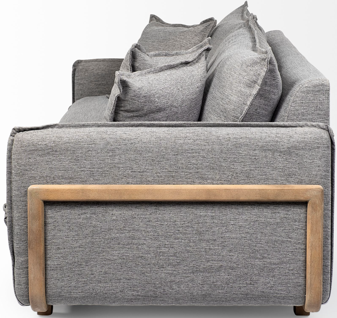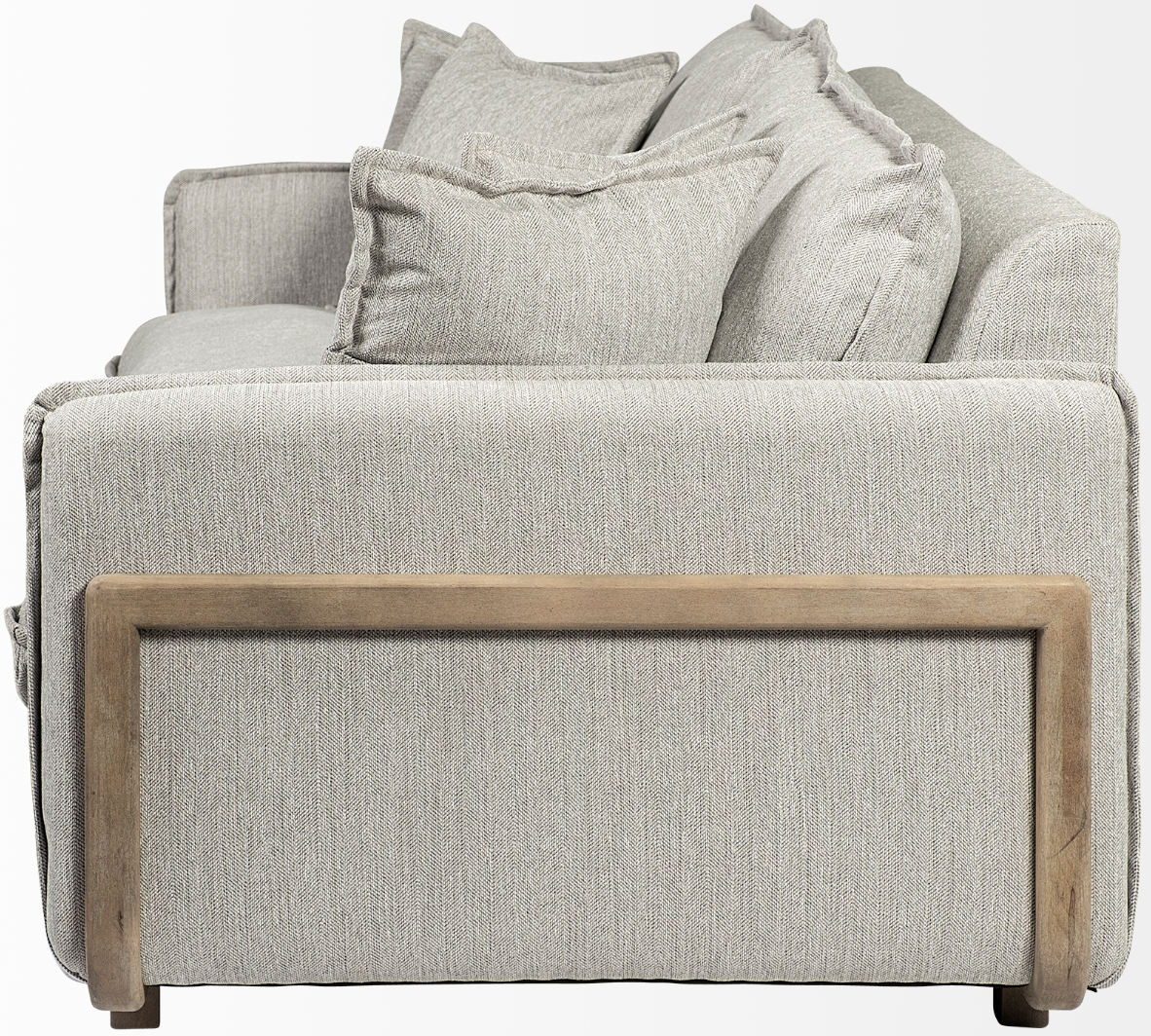 Crafted from solid wood, the Roy sofa is a spectacular, upholstered sofa that comfortably seats three. Featuring an exceptionally durable and sturdy four-legged mango wood frame finished in a natural brown polish, the Roy boasts of plush, fabric wrapped seating that is not only comfortable but also complements the wooden components of this ritzy sofa. Equipped with two detachable back cushions and four matching throw pillows that add to its luxurious seating experience, the Roy makes for the perfect addition to modern, farmhouse and coastal design styles.