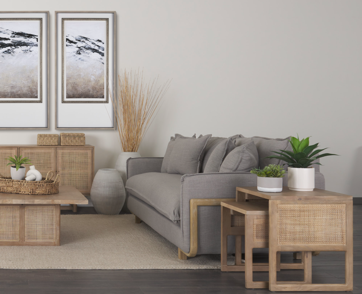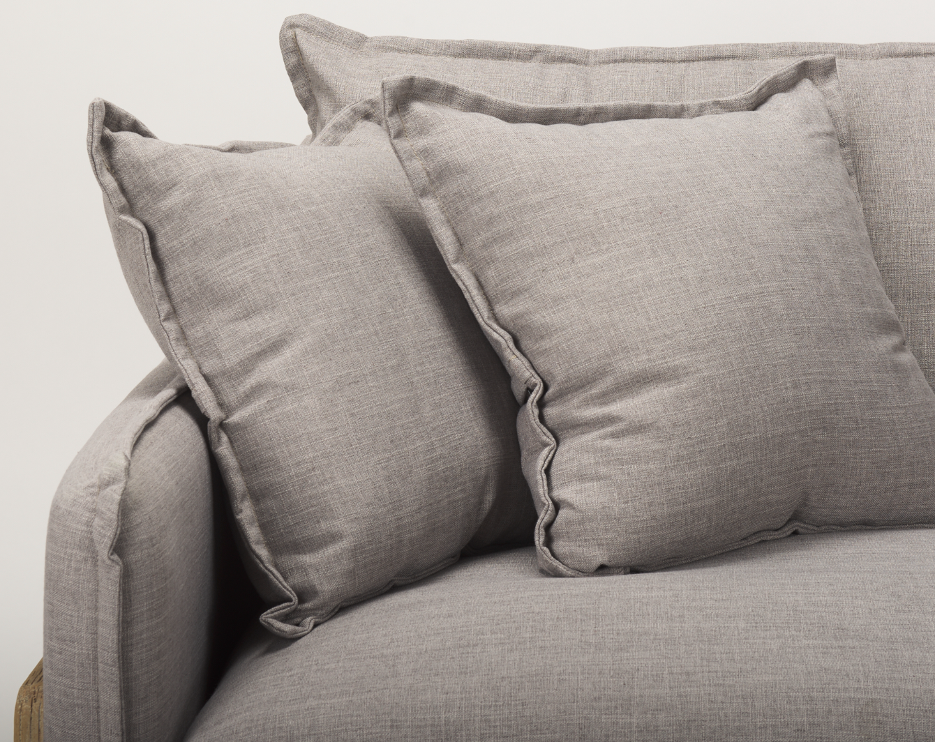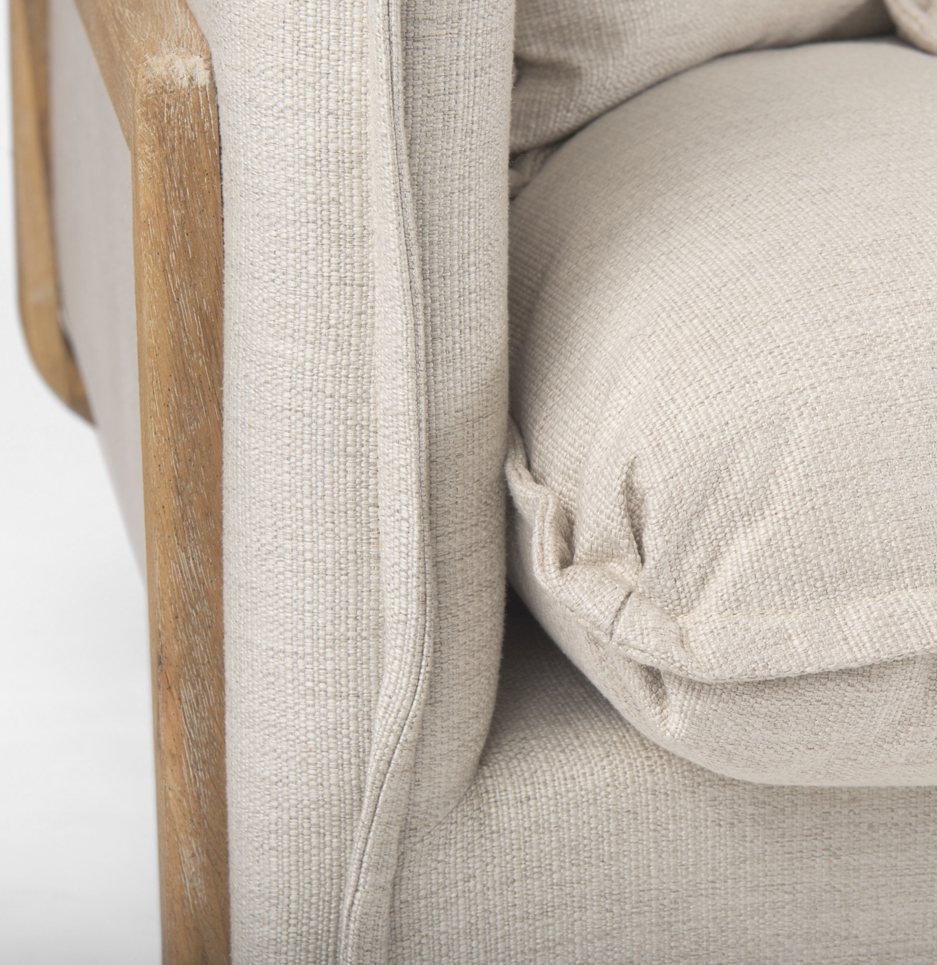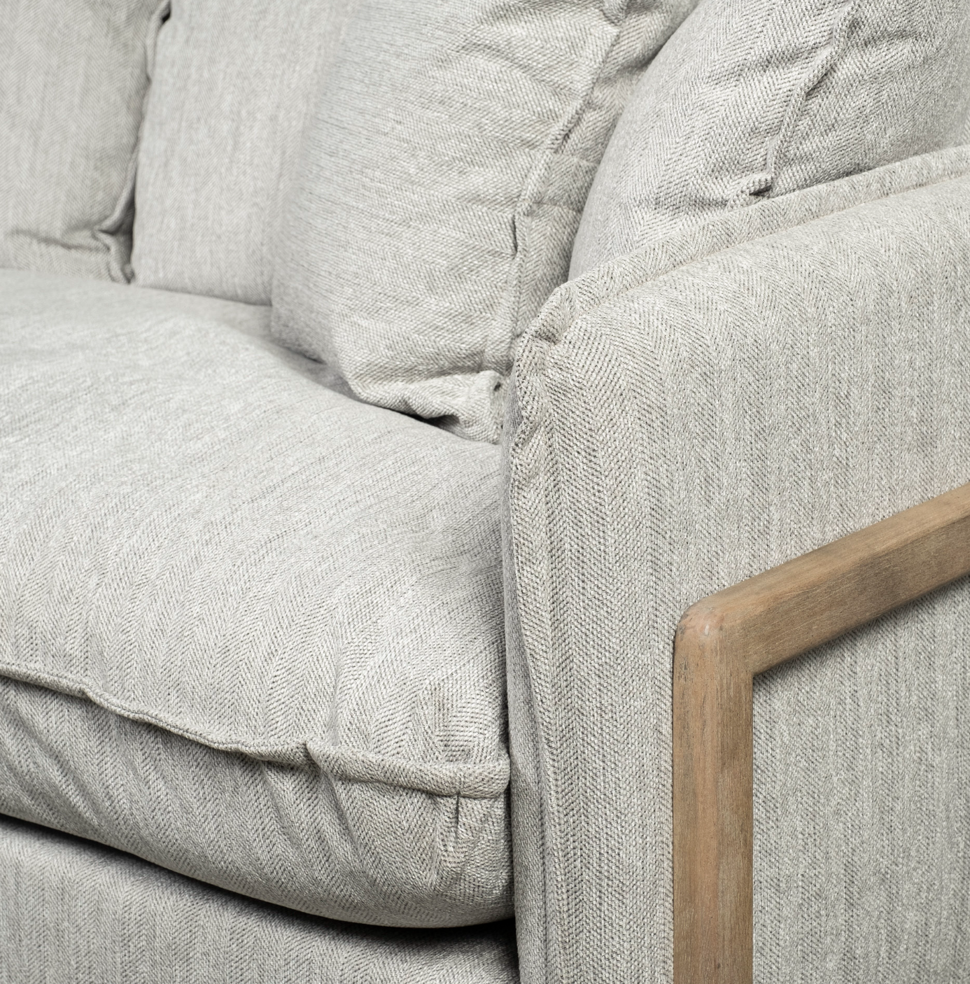 Crafted from solid wood, the Roy sofa is a spectacular, upholstered sofa that comfortably seats three. Featuring an exceptionally durable and sturdy four-legged mango wood frame finished in a natural brown polish, the Roy boasts of plush, fabric wrapped seating that is not only comfortable but also complements the wooden components of this ritzy sofa. Equipped with two detachable back cushions and four matching throw pillows that add to its luxurious seating experience, the Roy makes for the perfect addition to modern, farmhouse and coastal design styles.