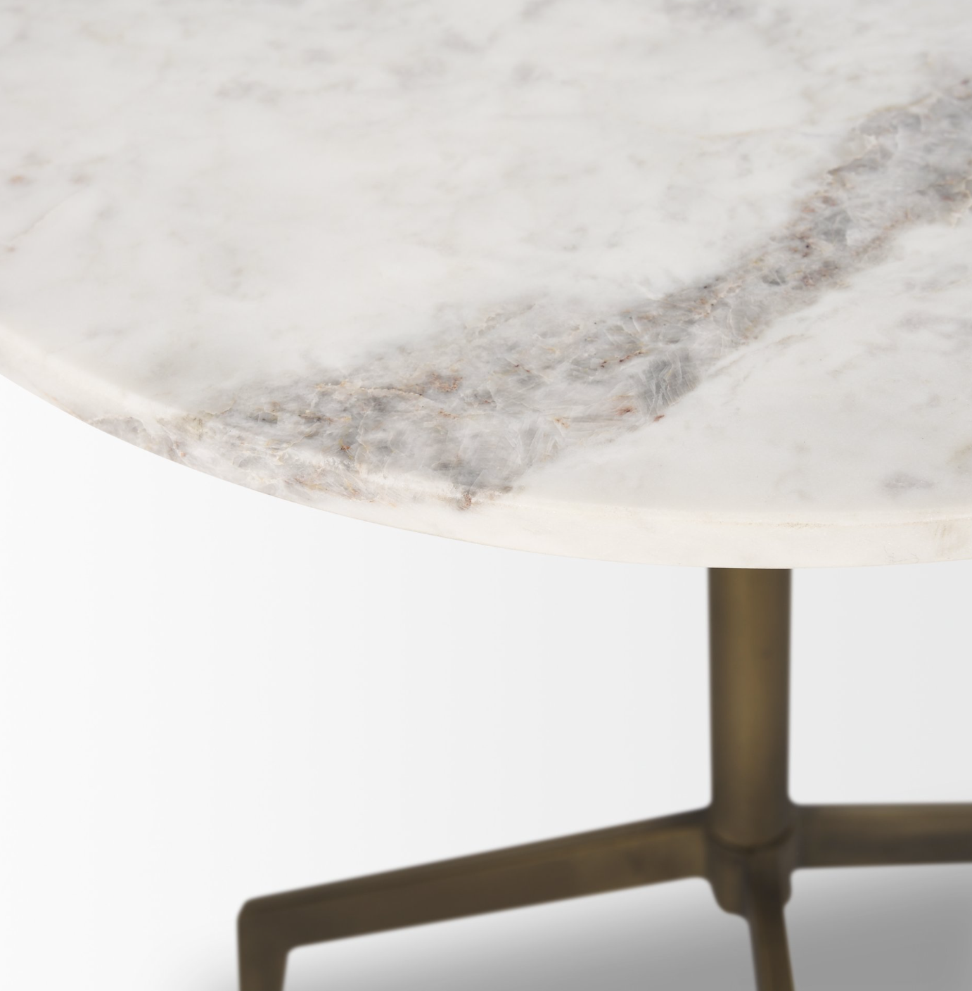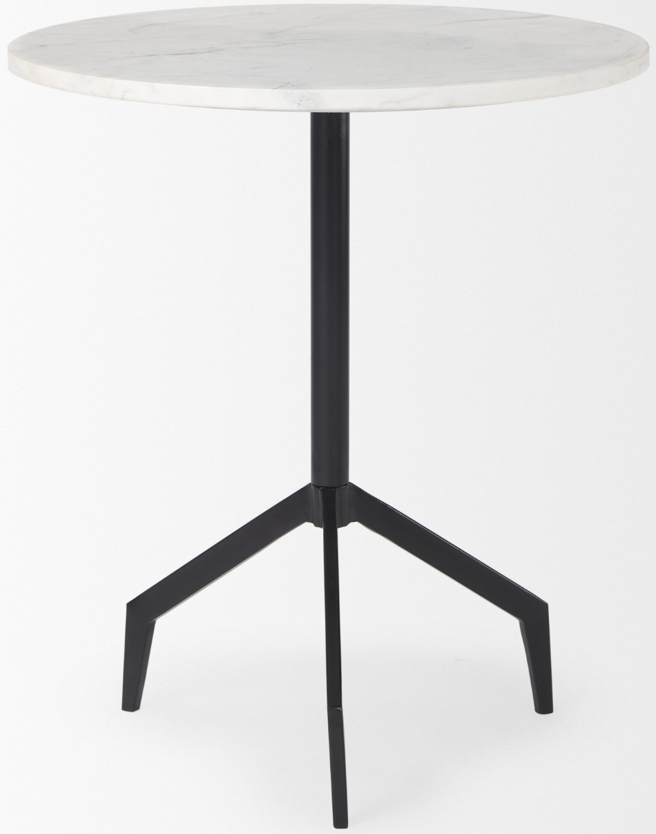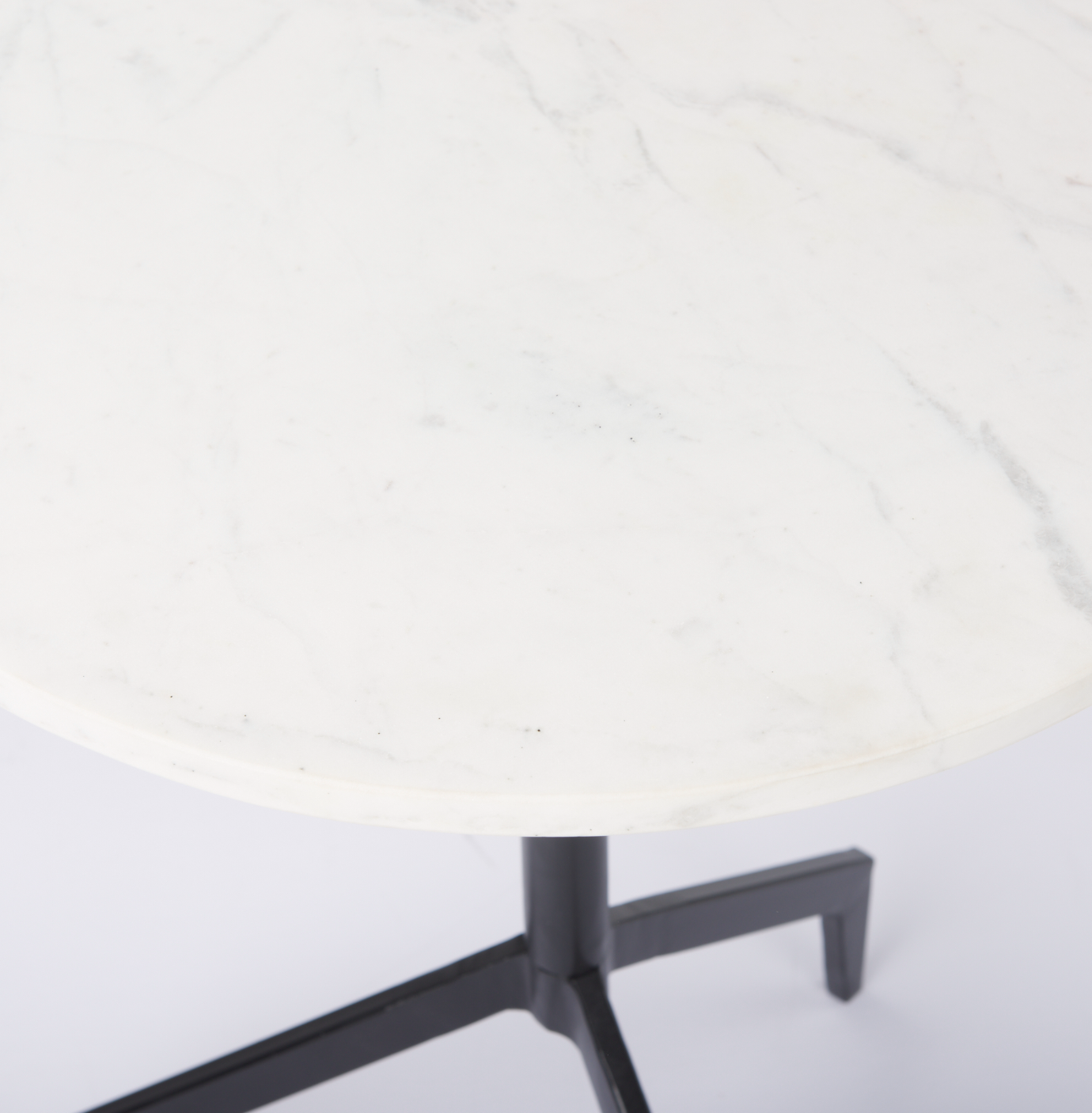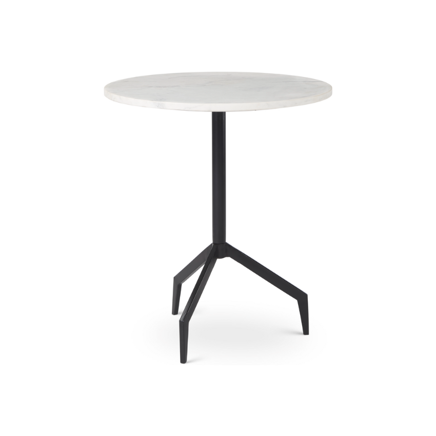 The Serre Side Table features a beautiful, smooth round white marble table top with natural veining. The base is made of matte black or gold finished metal in a unique, tri-pod design that lends a chic edginess to the timeless design. The neutral colour palette allows this table to seamlessly be integrated into various applications and design styles.