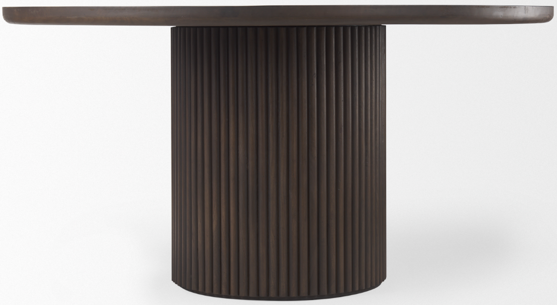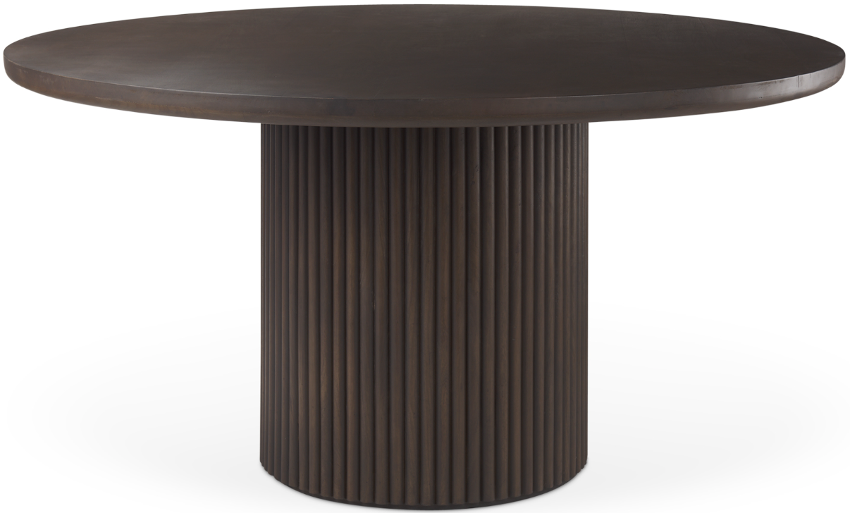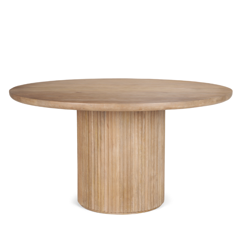 A stunning, contemporary dining table made from solid mango wood that features a smooth round top and a fluted round base