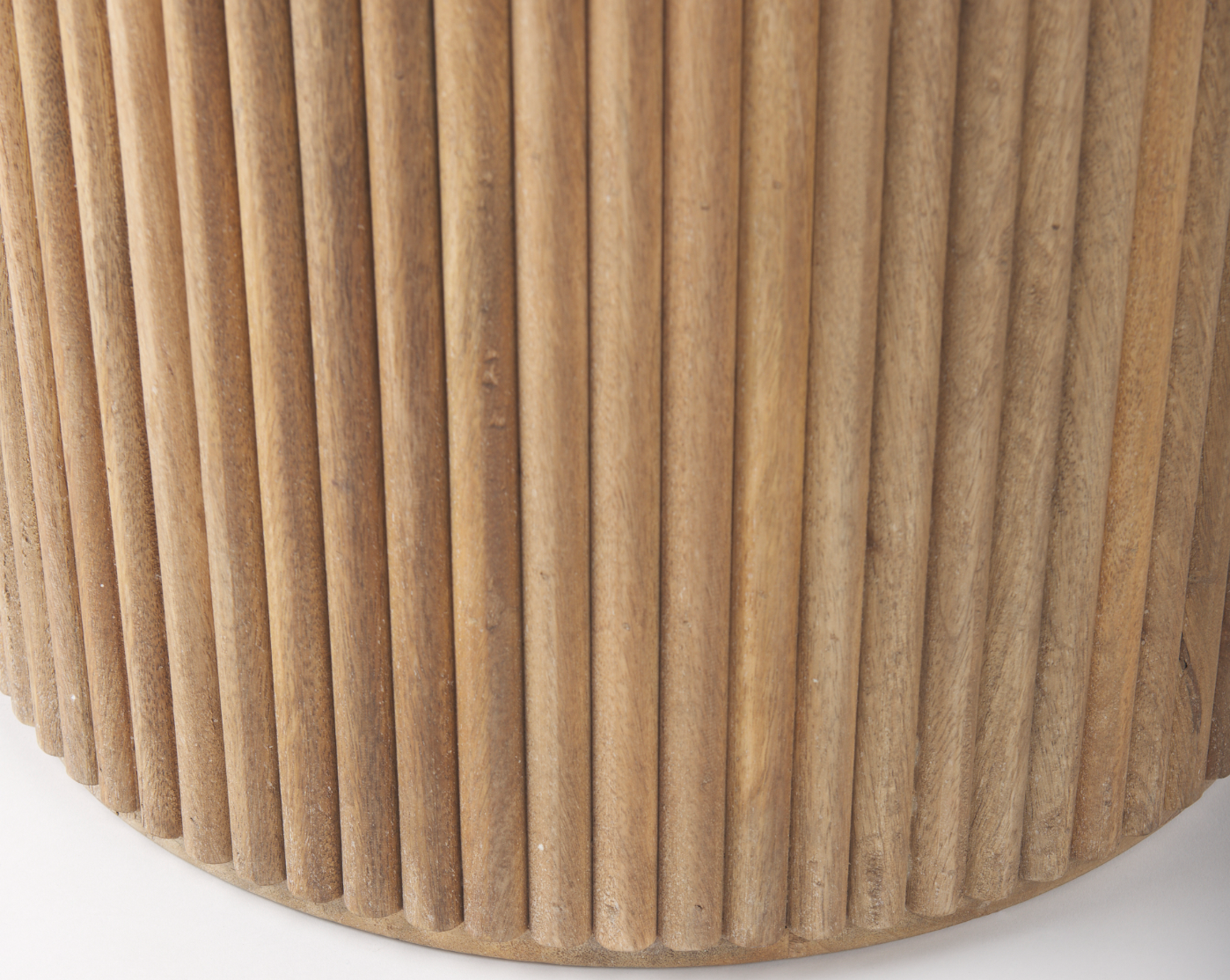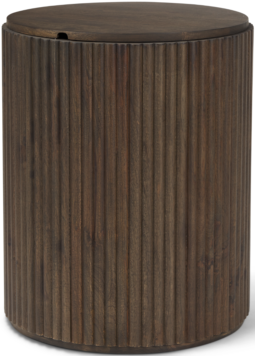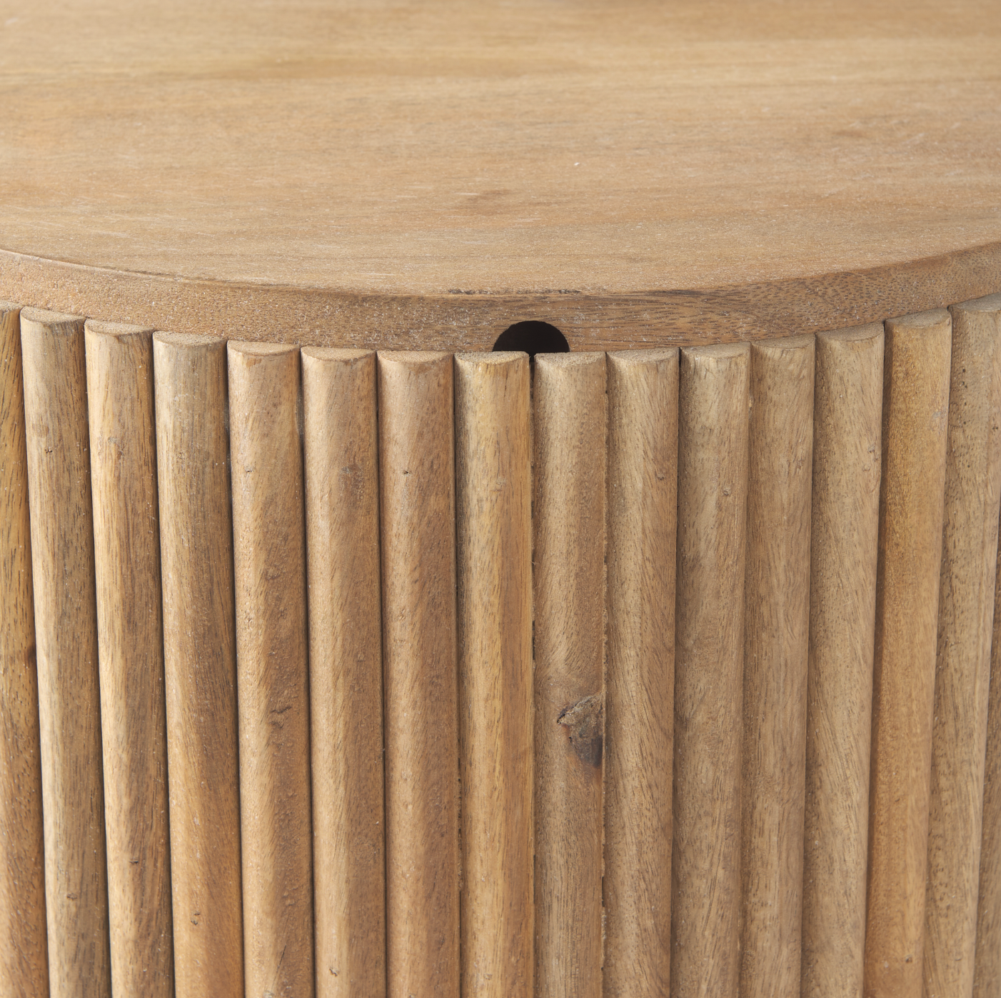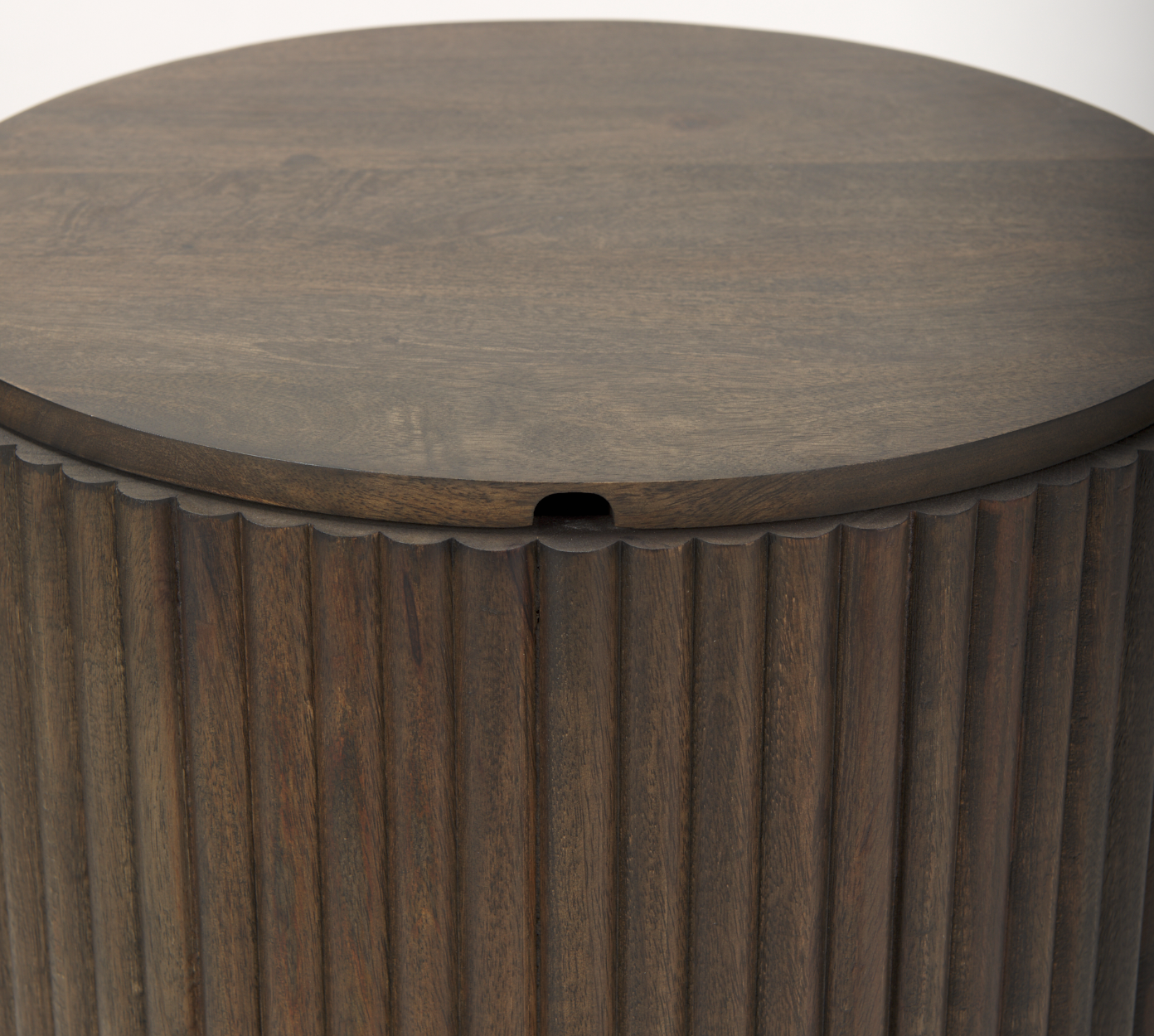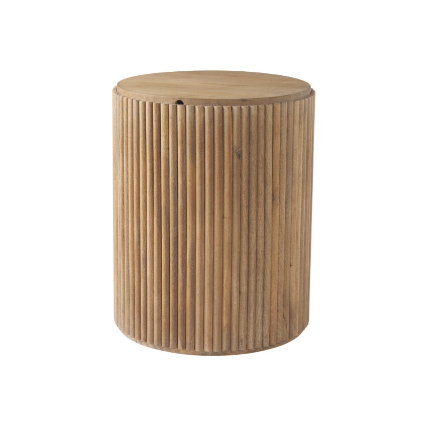 The Terra Side Table is a beautiful statement piece to include in the home or office space. Bold, contemporary, and trendy this eye-catching piece has been fashioned from solid mango wood, whose beautiful grain can be seen on the round top and amidst the fluted round base. Not only is this side table stunning, but it also opens from the top to provide storage! This quality table pairs perfectly with the Terra Coffee Table, Dining Table, and Sideboard.
