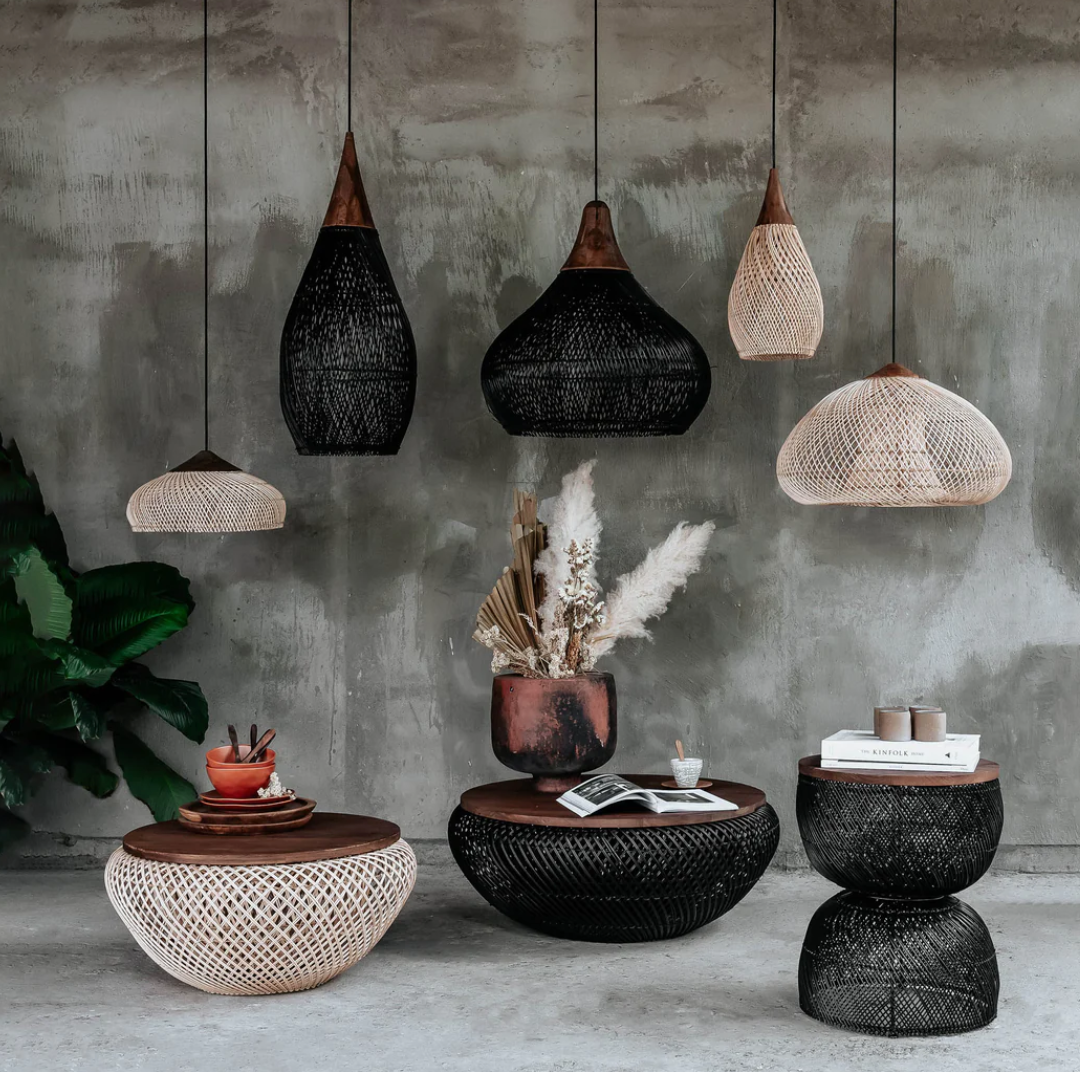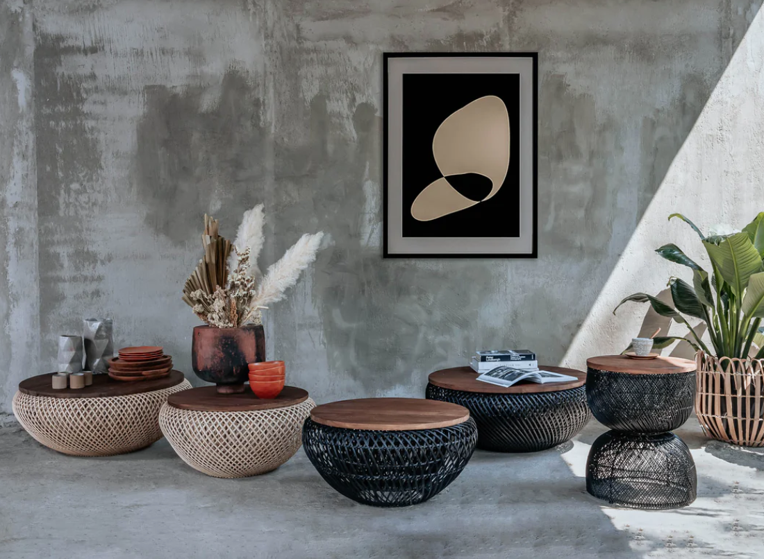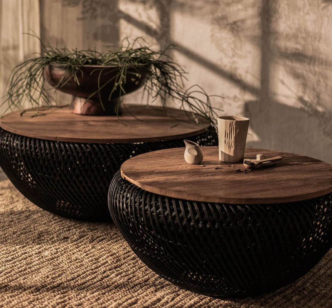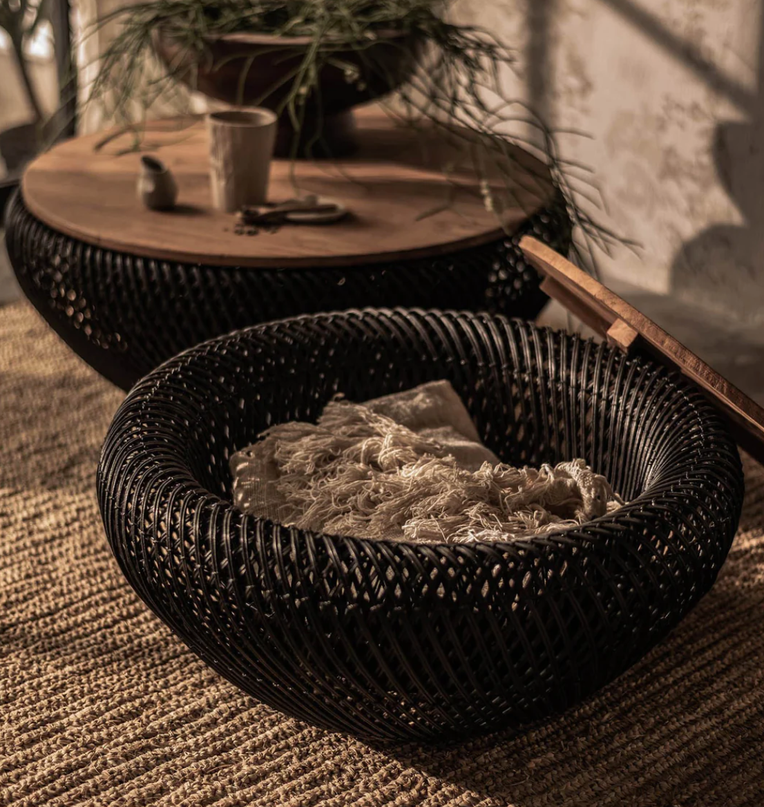 Made from ethically sourced natural materials, this table is full of character and history, and doubles as a storage space. The top is sturdy reclaimed teak with a traditional rattan weave for the base. The base is given a natural finish evoking volcanic rock or tropical midnight while the top reflects unique patterns found only in nature.