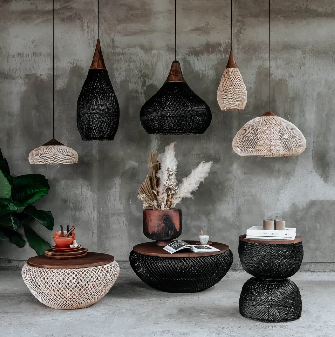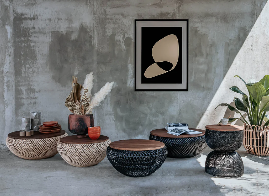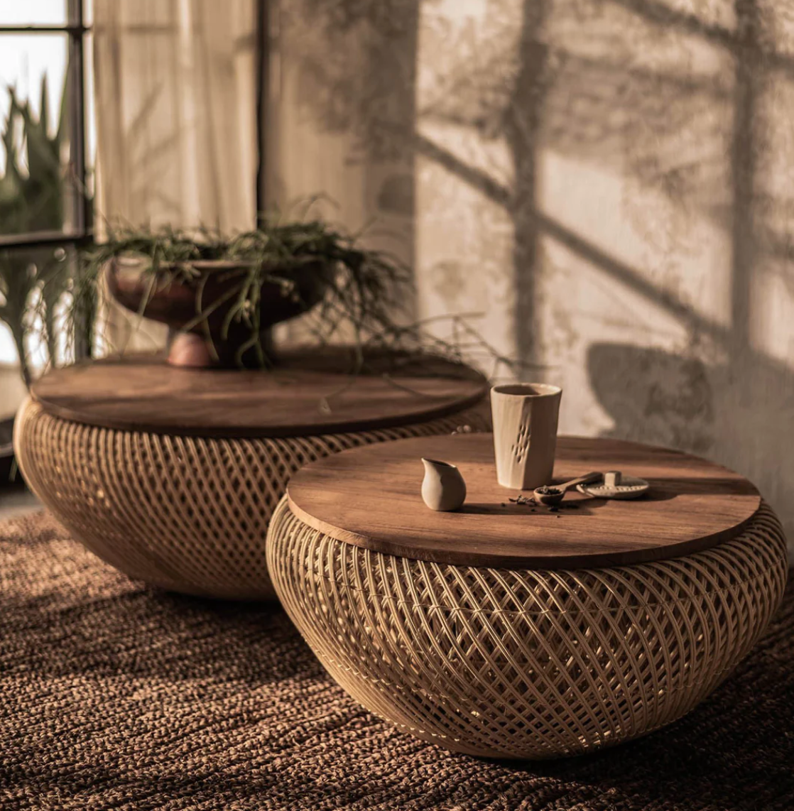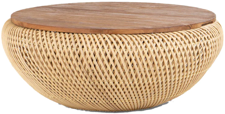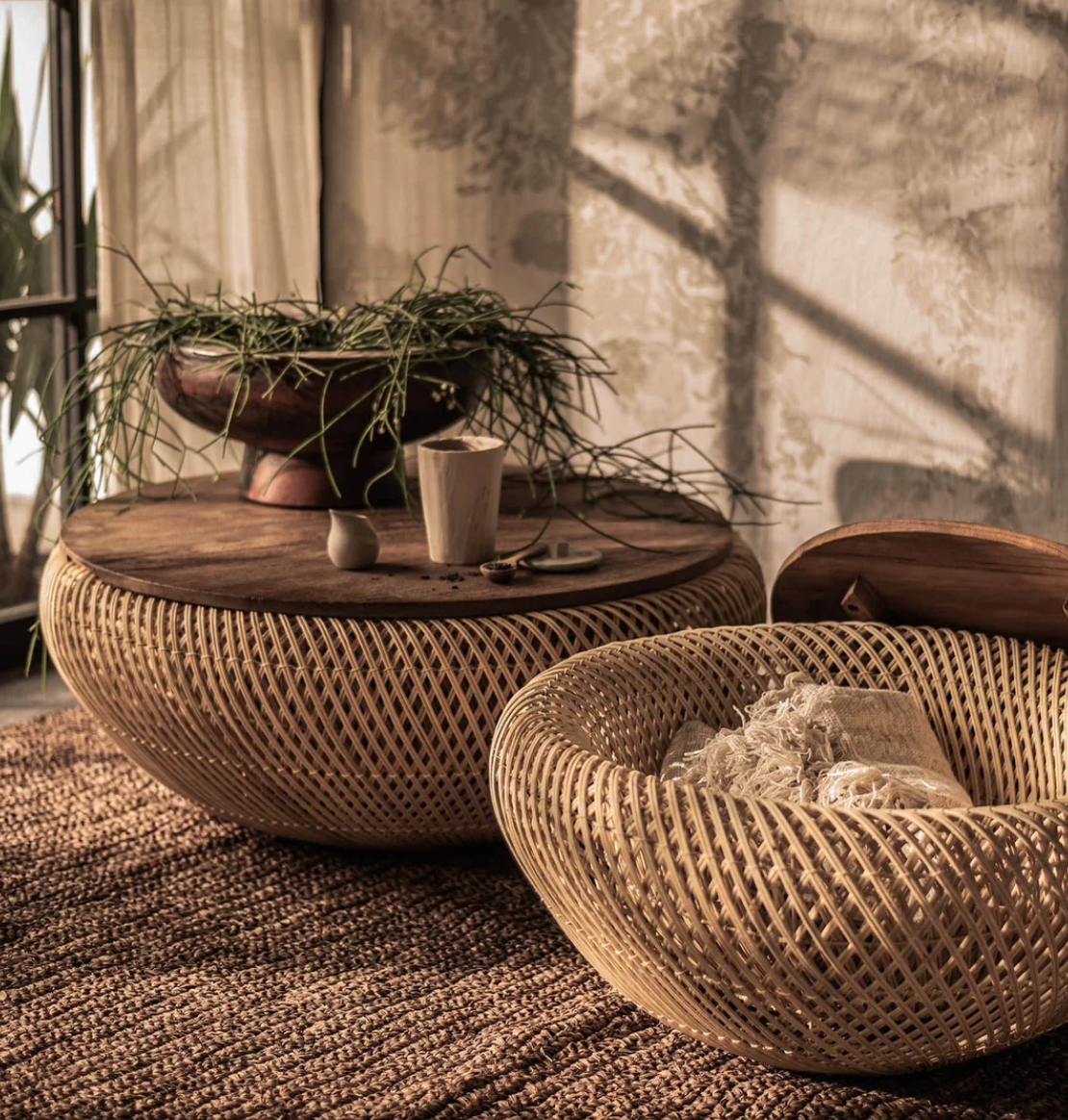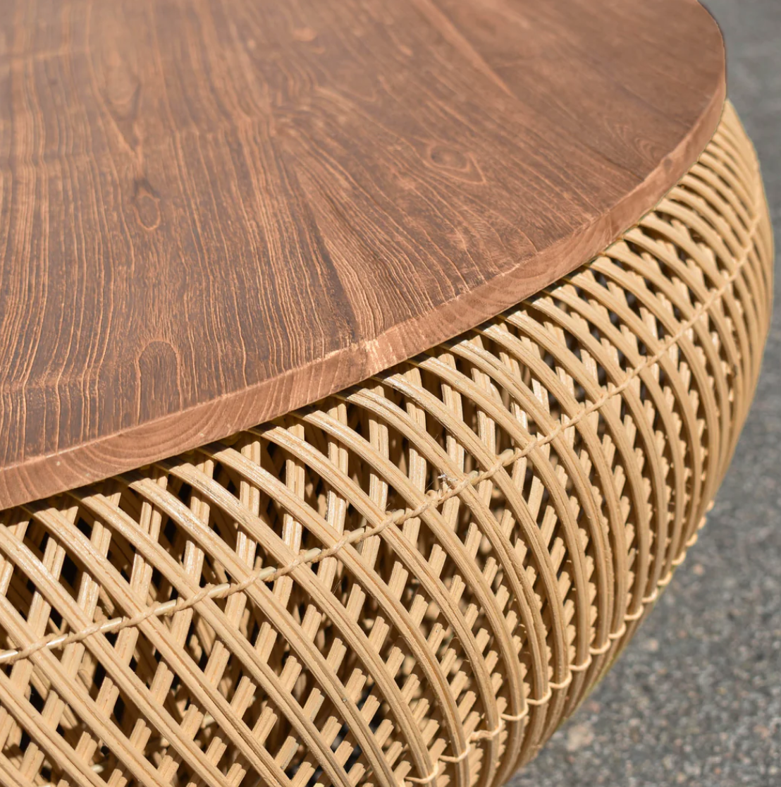 Made from ethically sourced natural materials, this table is full of character and history, and doubles as a storage space. The top is sturdy reclaimed teak with a traditional rattan weave for the base. The base is given a natural finish evoking volcanic rock or tropical midnight while the top reflects unique patterns found only in nature.
